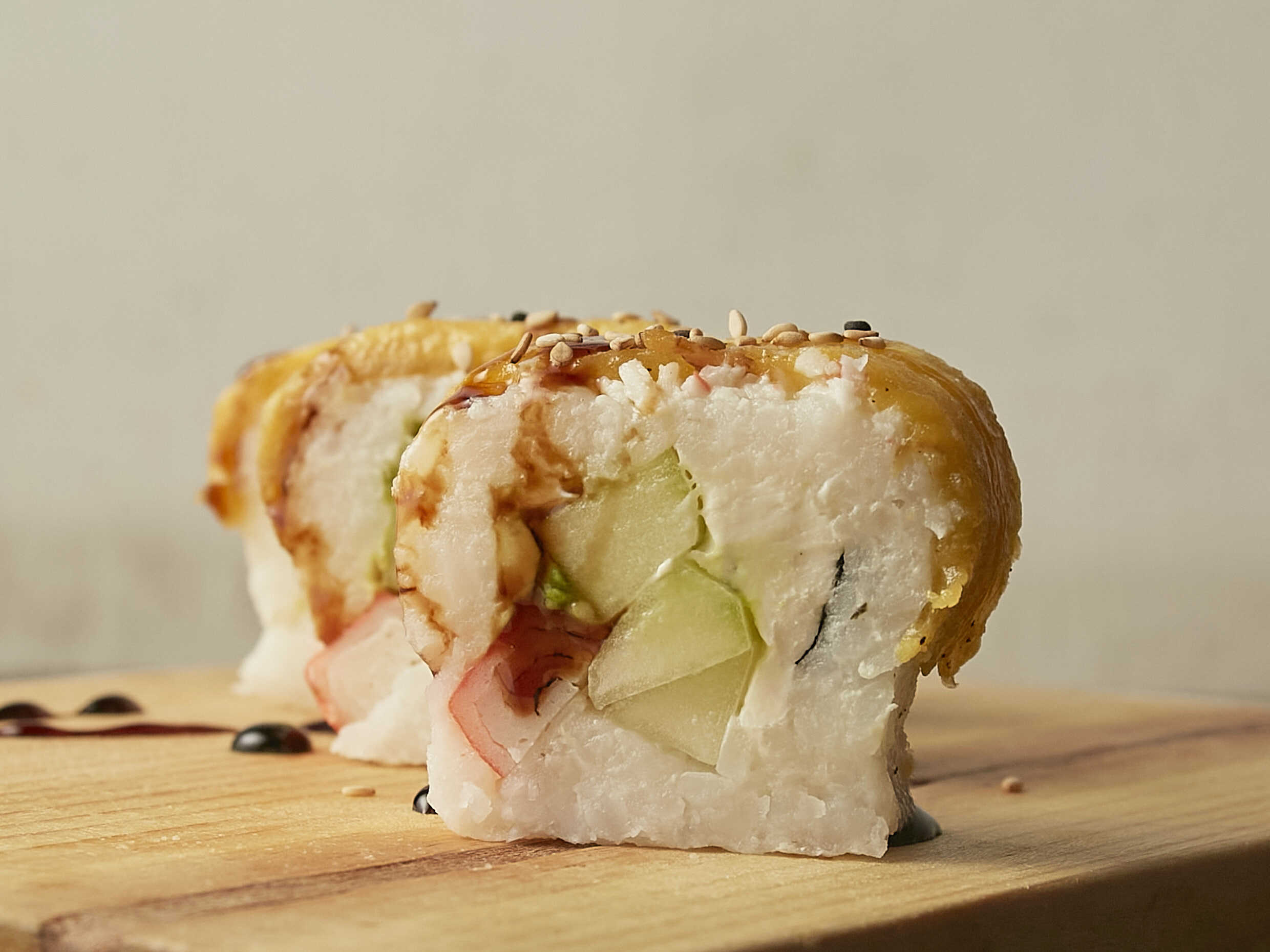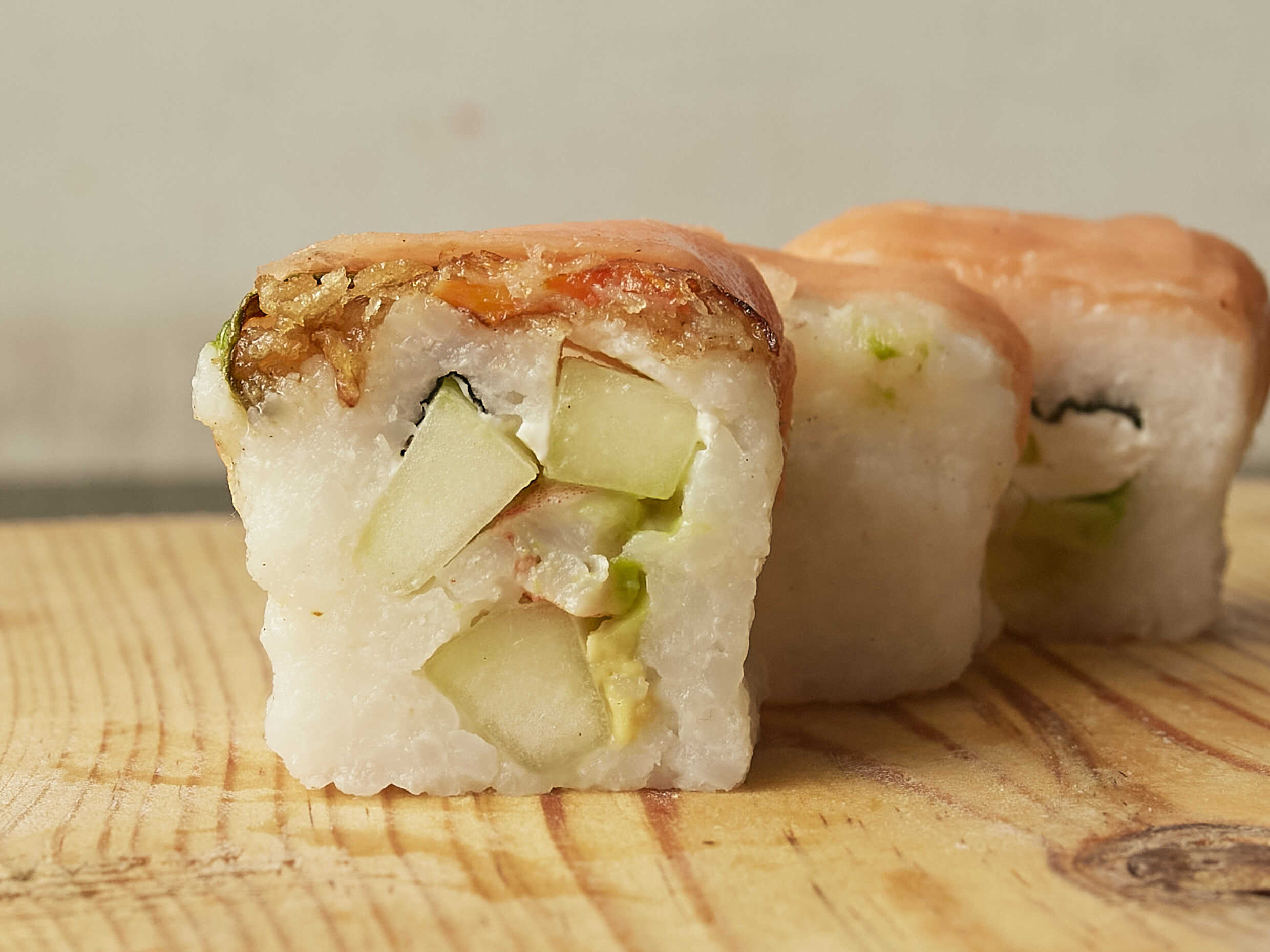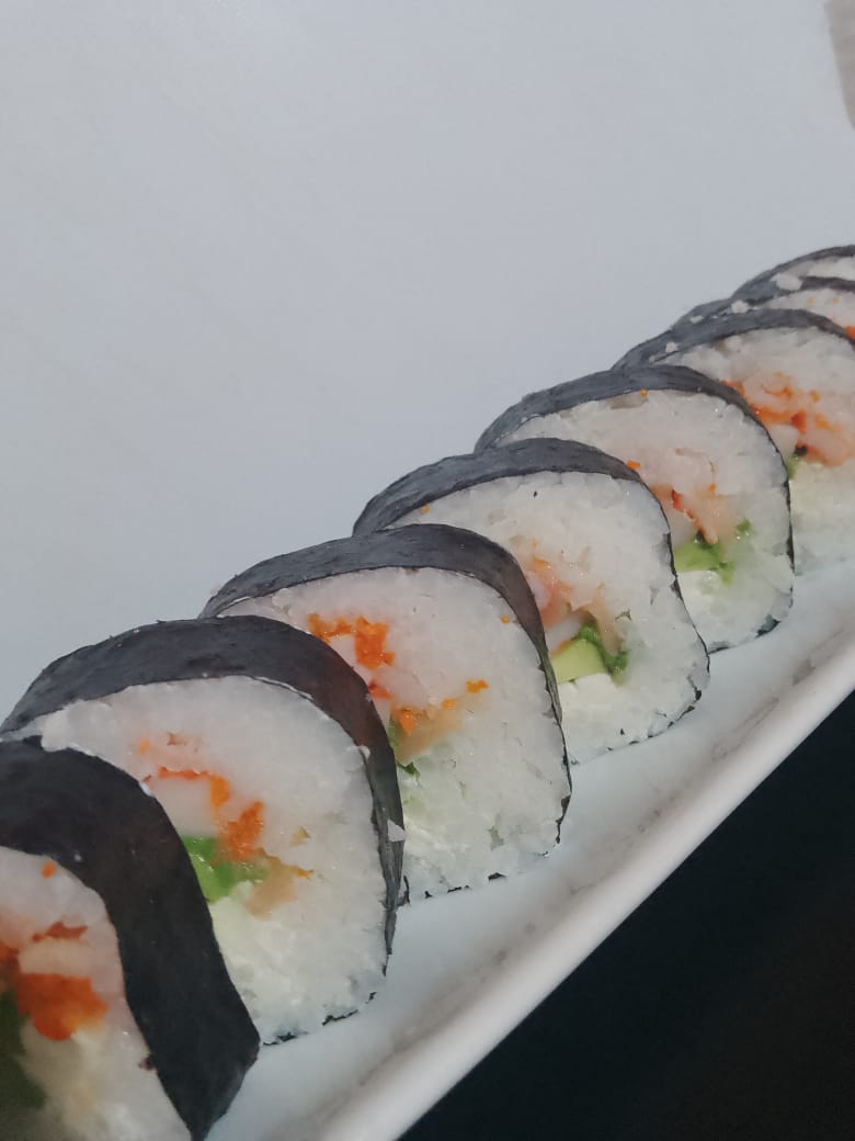 Tampico,salmón, aguacate, pepino, queso y massago por fuera