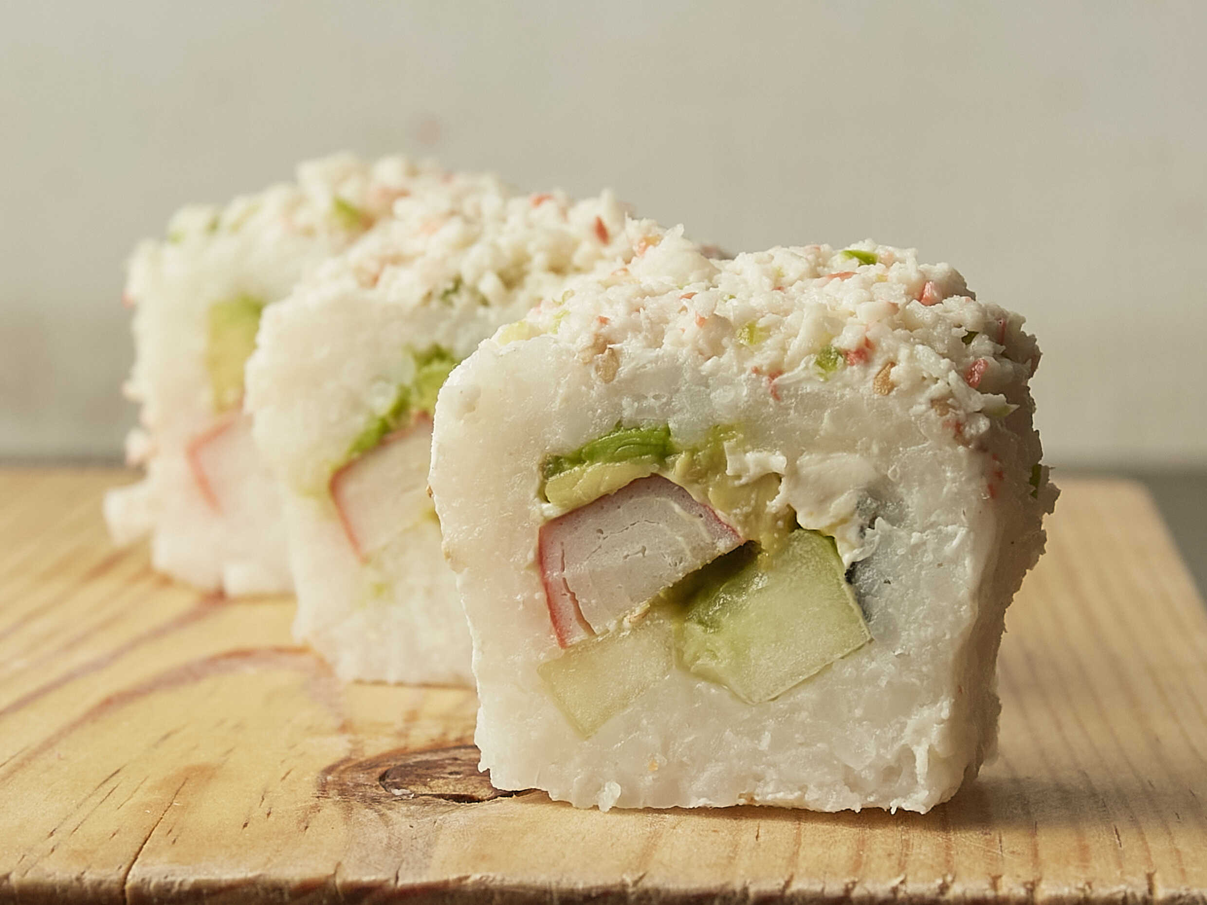 Massago, queso philadelphia , cangrejo, pepino, aguacate,