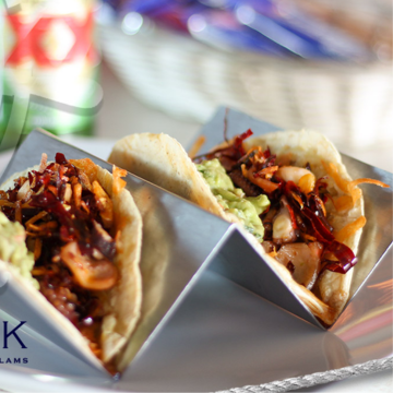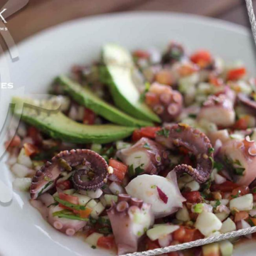 Pulpo salteado con ajo, guajillo, mantequilla y aceite de olivo, sobre una cama de aguacate en tortilla de harina de mantequilla, Estilo Baja.