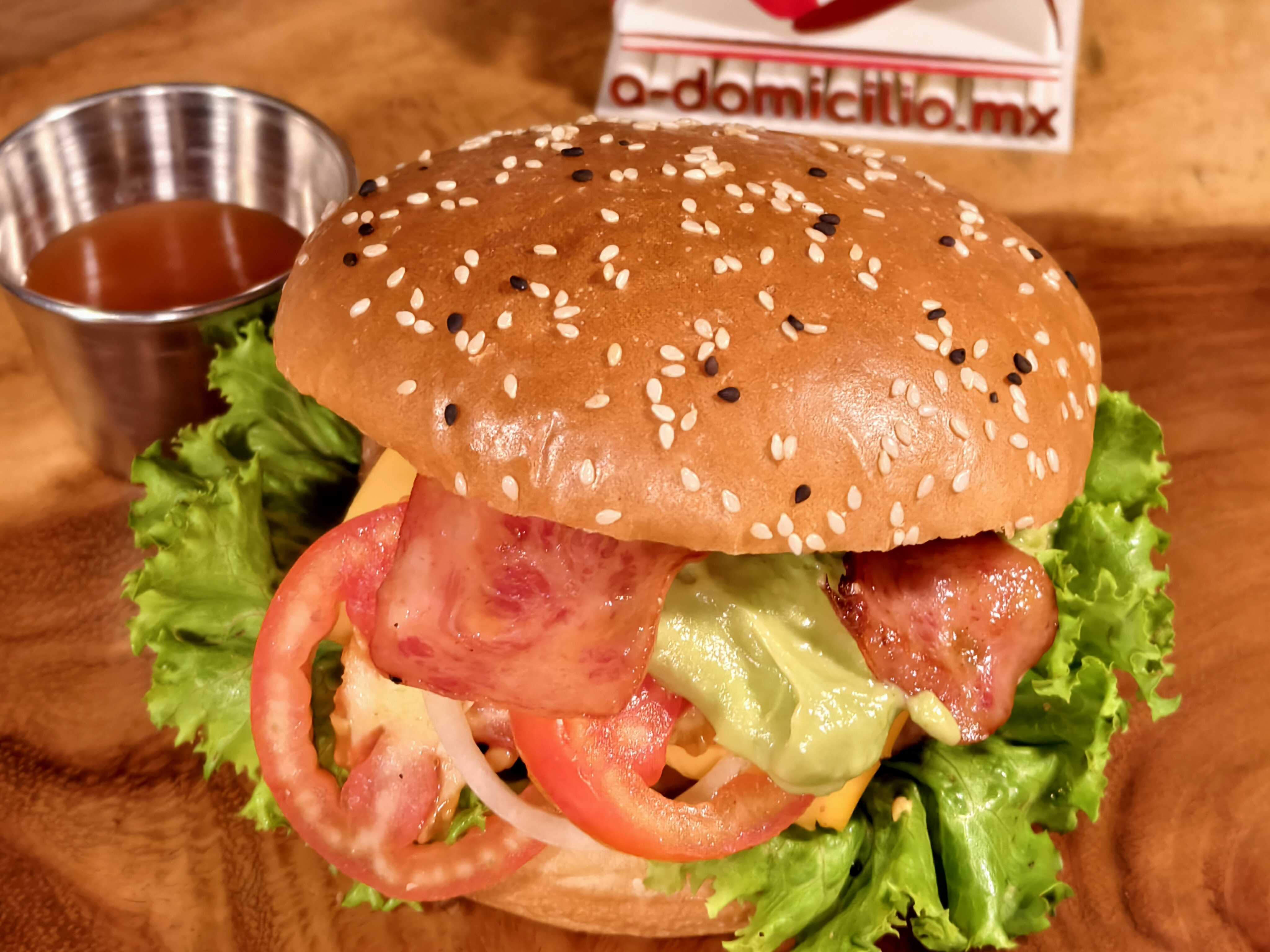 Hamburguesa con una carne de 90-110g, Queso Americano, Tocino, Vegetales y Guacamole