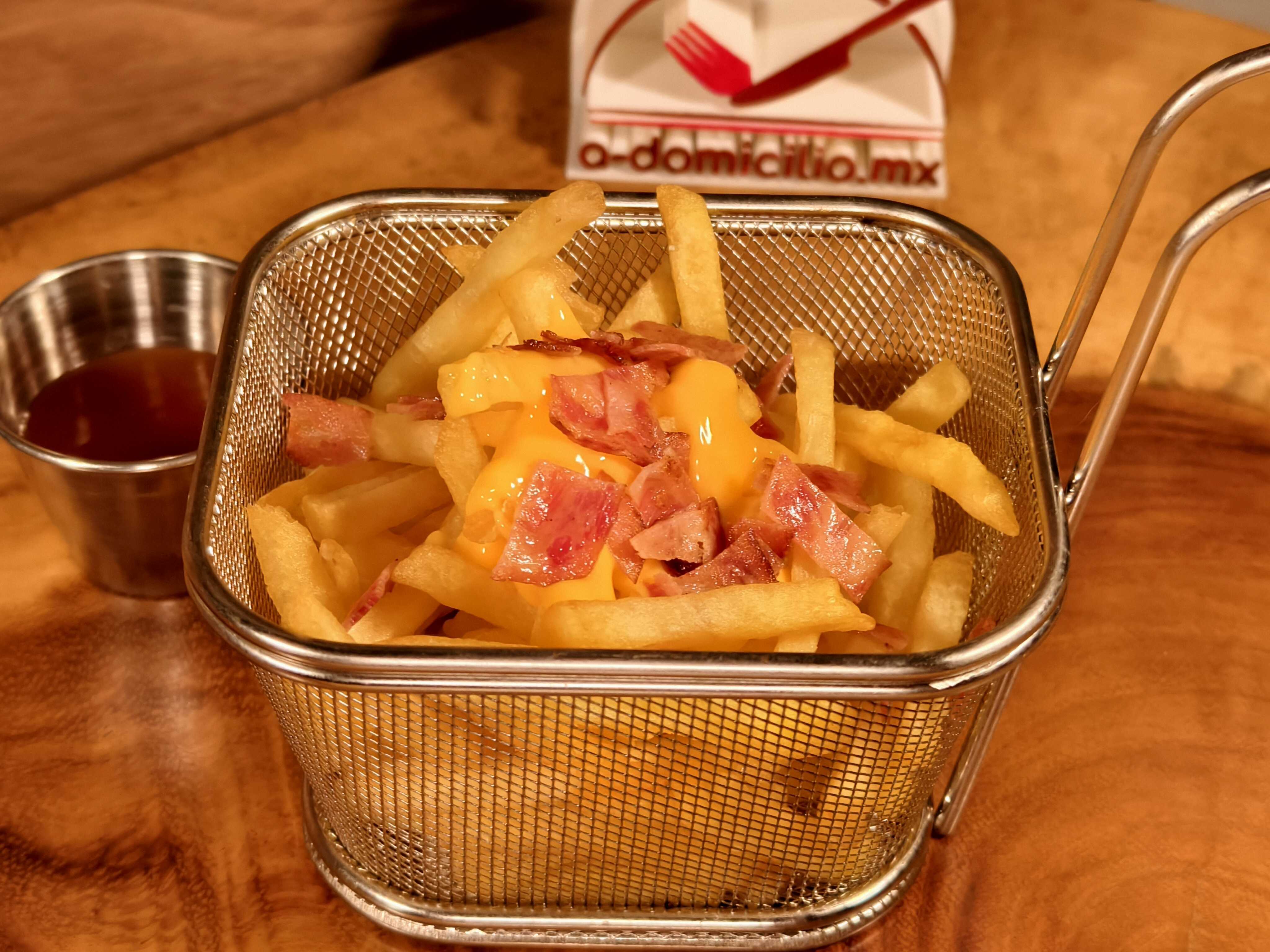 200g de papas a la francesa bañadas en queso americano fundido y trozos de tocino