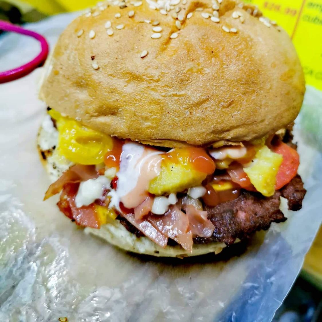 Delicioso pan artesanal, carne preparada acompañada con trocitos de jamón, doble queso y cebolla caramelizada.