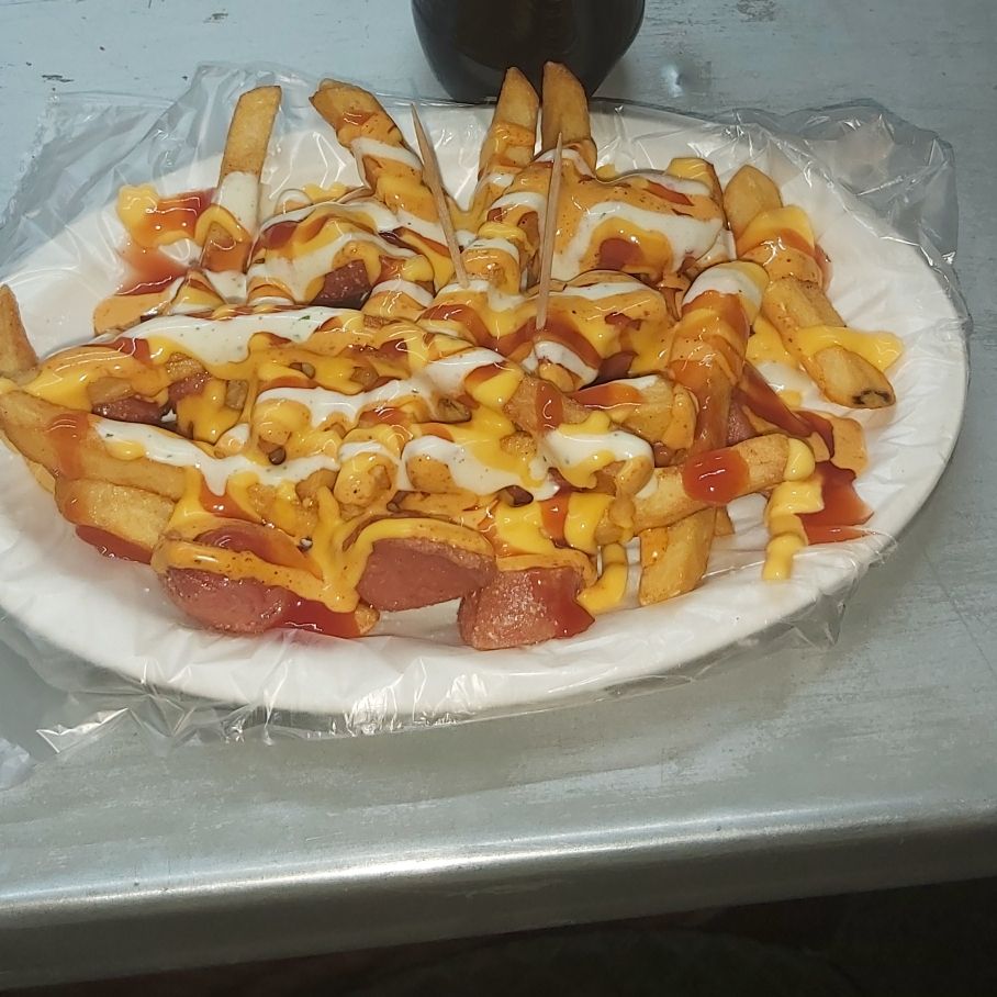 Papa a la francesa acompañada de salchicha picada cubierta de queso amarillo derretido, mayonesa y cátsup.