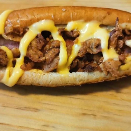 Delicioso pan artesanal, salchicha de pavo envuelta en tocino acompañada de queso amarillo derretido y trocitos de chicharrón.