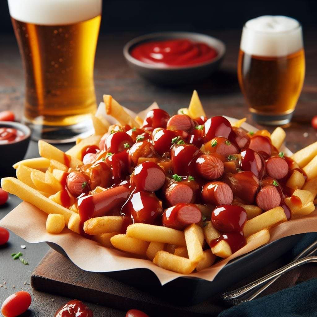 Un plato de papas a la francesa, salchichas, tocino, queso gratinado, mermelada de habanero.
