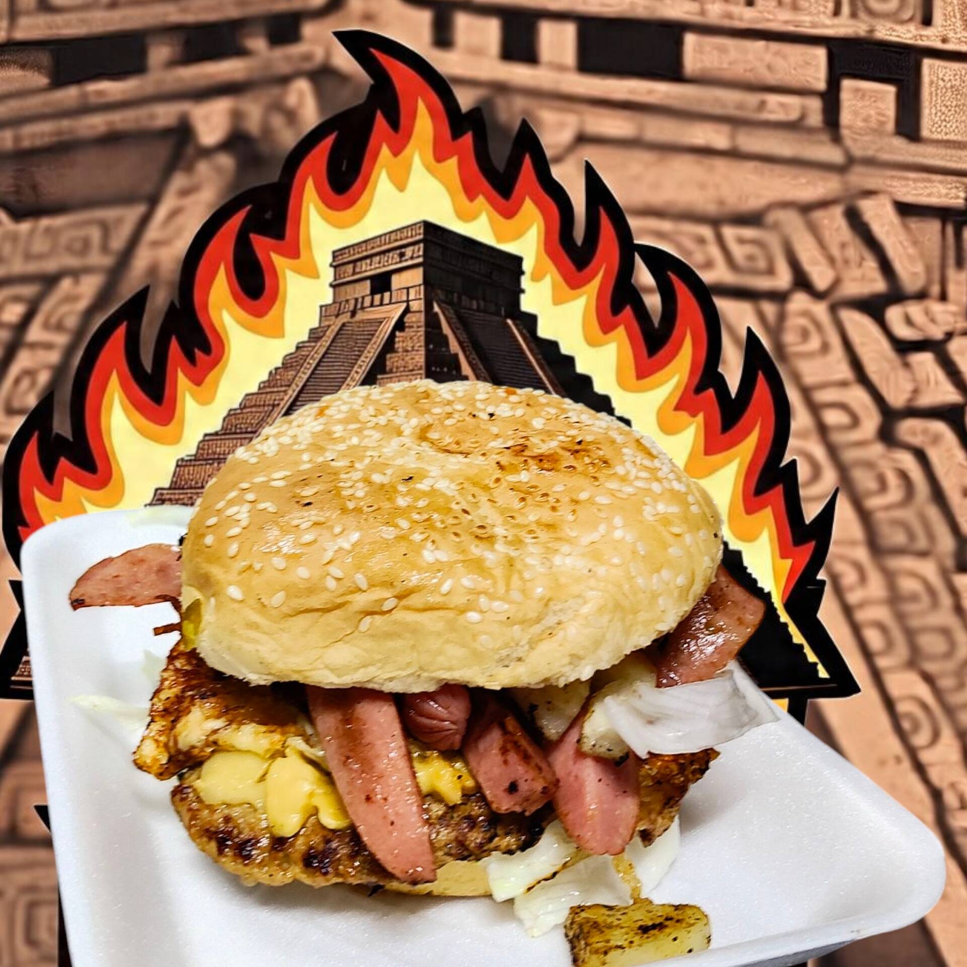 Hamburguesa con doble carne, salchicha, jamón, tocino, doble queso amarillo, quesillo, lechuga, jitomate, cebolla caramelizada, piña o champiñón.