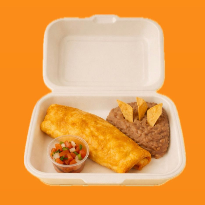Burrito con frijoles refritos, huevo revuelto y una deliciosa tira de tocino