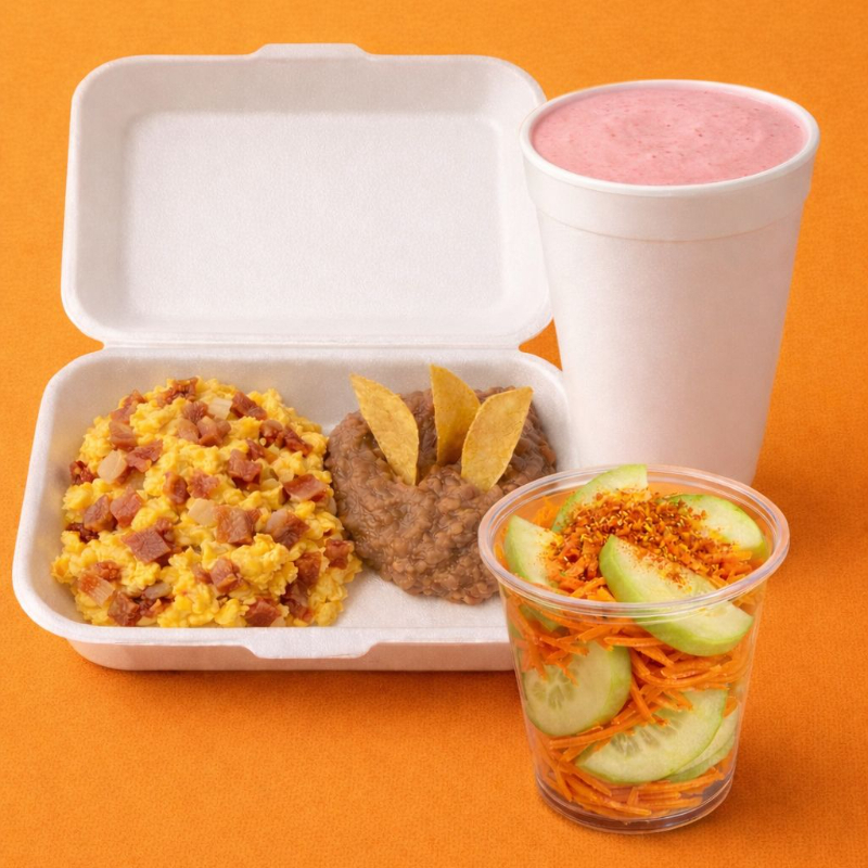 HUEVOS CON TOCINO Y BEBIDA