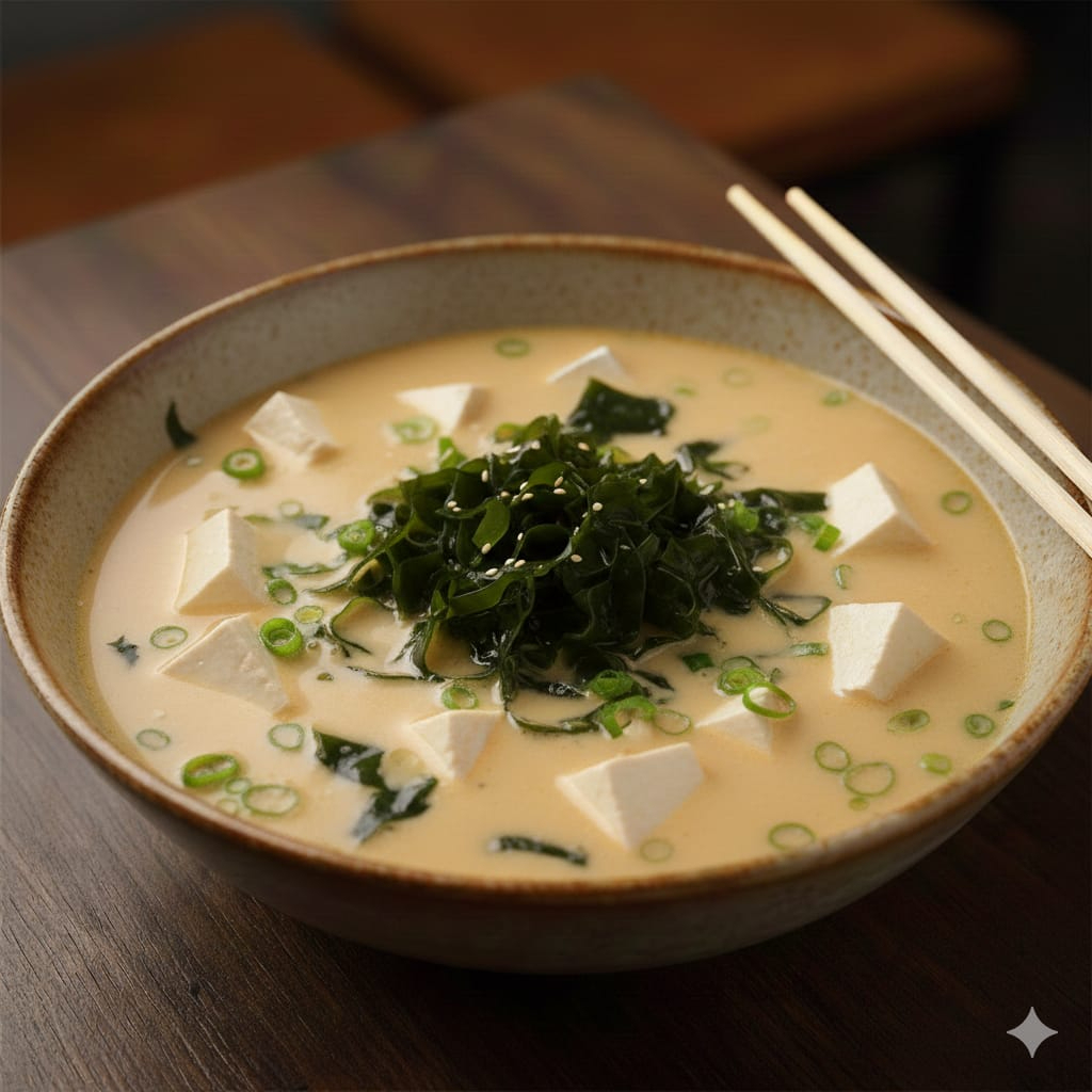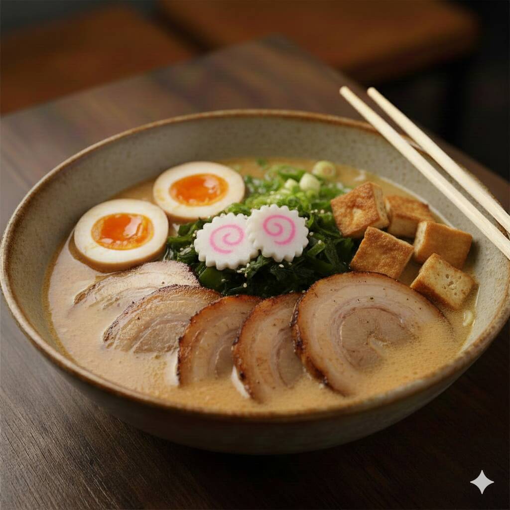 Base ramen cremoso con wakame, cebolla cambray frita cortada en rodajas, pork belly, naruto y 2 mitades de huevo, wakame y tofu