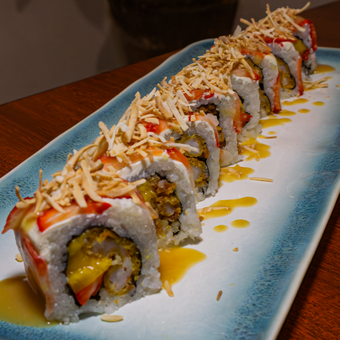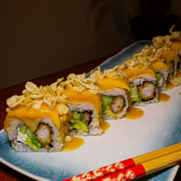 Por dentro: Camarón empanizado, queso crema, pepino, aguacate Por fuera: mango, miso dulce, tanuki