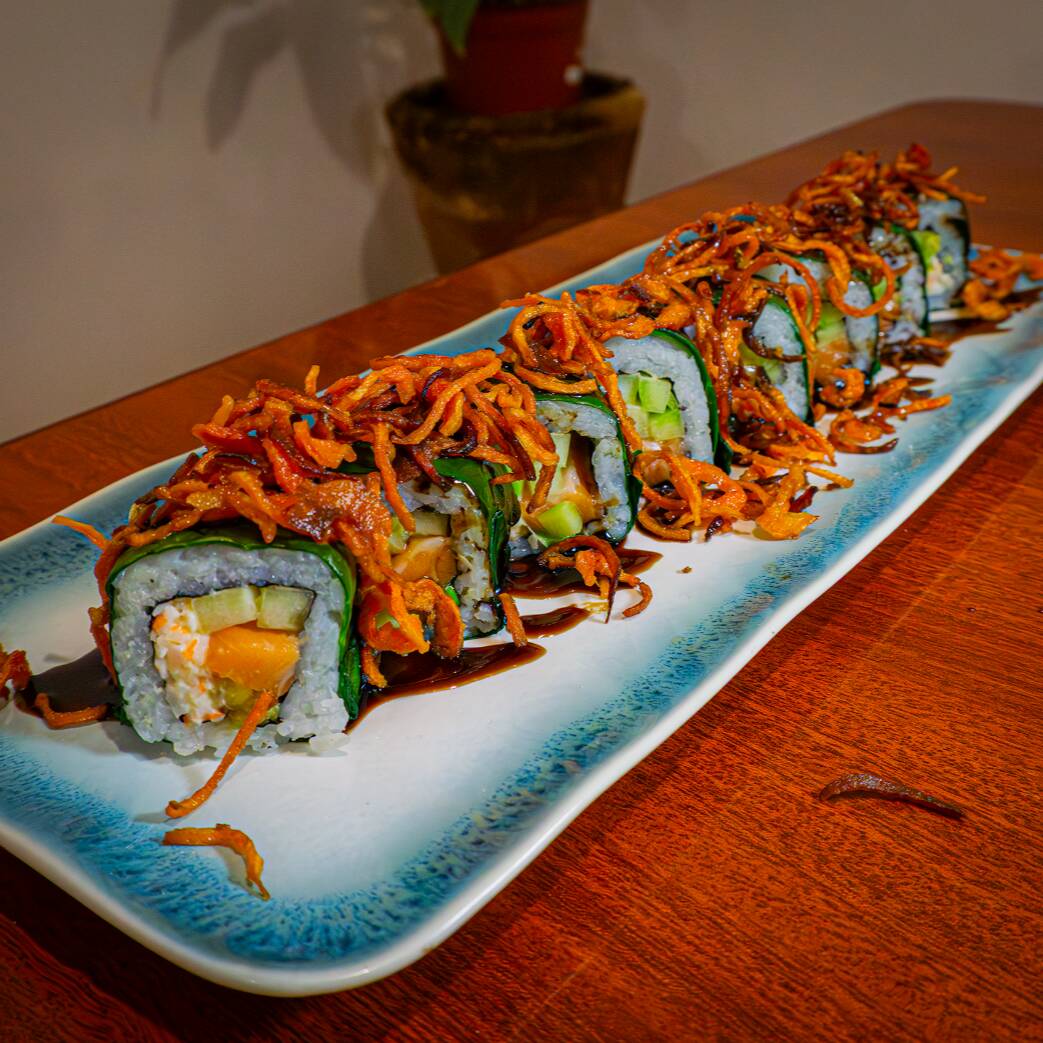 Por dentro queso crema, camarón empanizado. pepino. - Por fuera platano macho frito, salsa mayo chipotle, salsa de anguila y ajonjolin negro