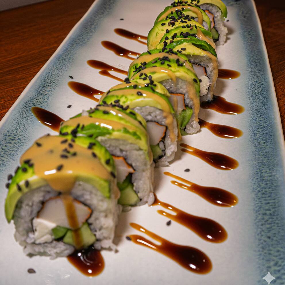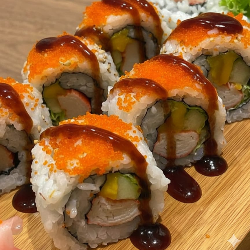 Por dentro: kanikama, pepino, aguacate Por fuera: Queso crema, masago, salsa de anguila