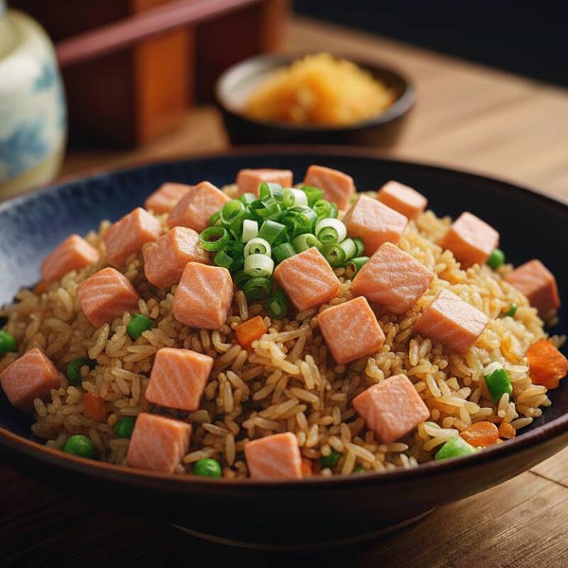 Arroz japones, 100 grms de salmón , con verduras(calabaza, zanahoria), soya y mantequilla de la casa