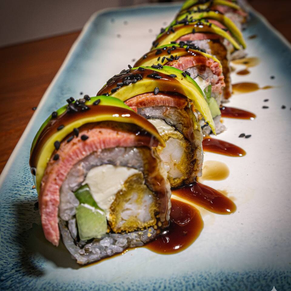 Por dentro camarón empanizado, pepino y queso crema. -Por fuera atún cocido, aguacate, salsa de anguila y ajonjolin negro