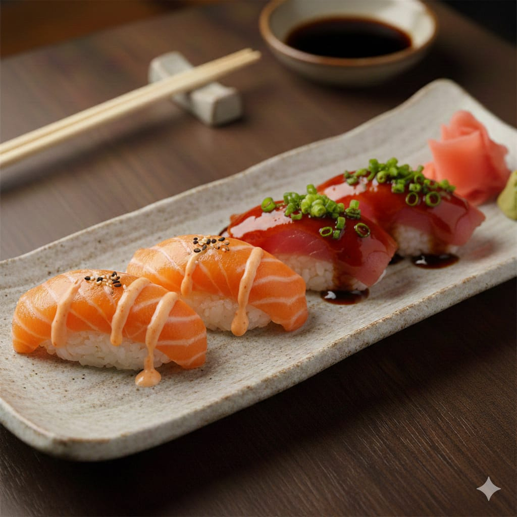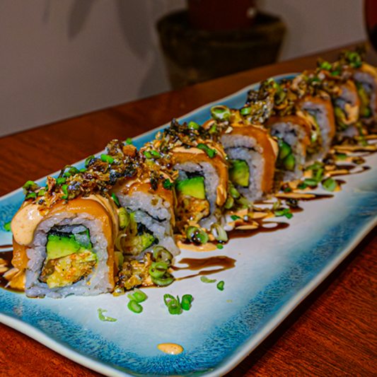 Por dentro: tanuki, masago, aguacate Por fuera: salmon, mayo Chipotle, chicharrón de salmon, cebollin