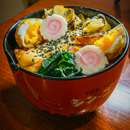 Ramen cremoso, con champiñon, cebolla cambray, huevo, naruto, wakame, salmón del atlántico bañado con mayo chipotle