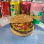 Hamburguesa con carne al carbón, pan tradicional, queso, tocino, jitomate, cebolla, chiles picados, cátsup y mostaza. Sin acompañantes
