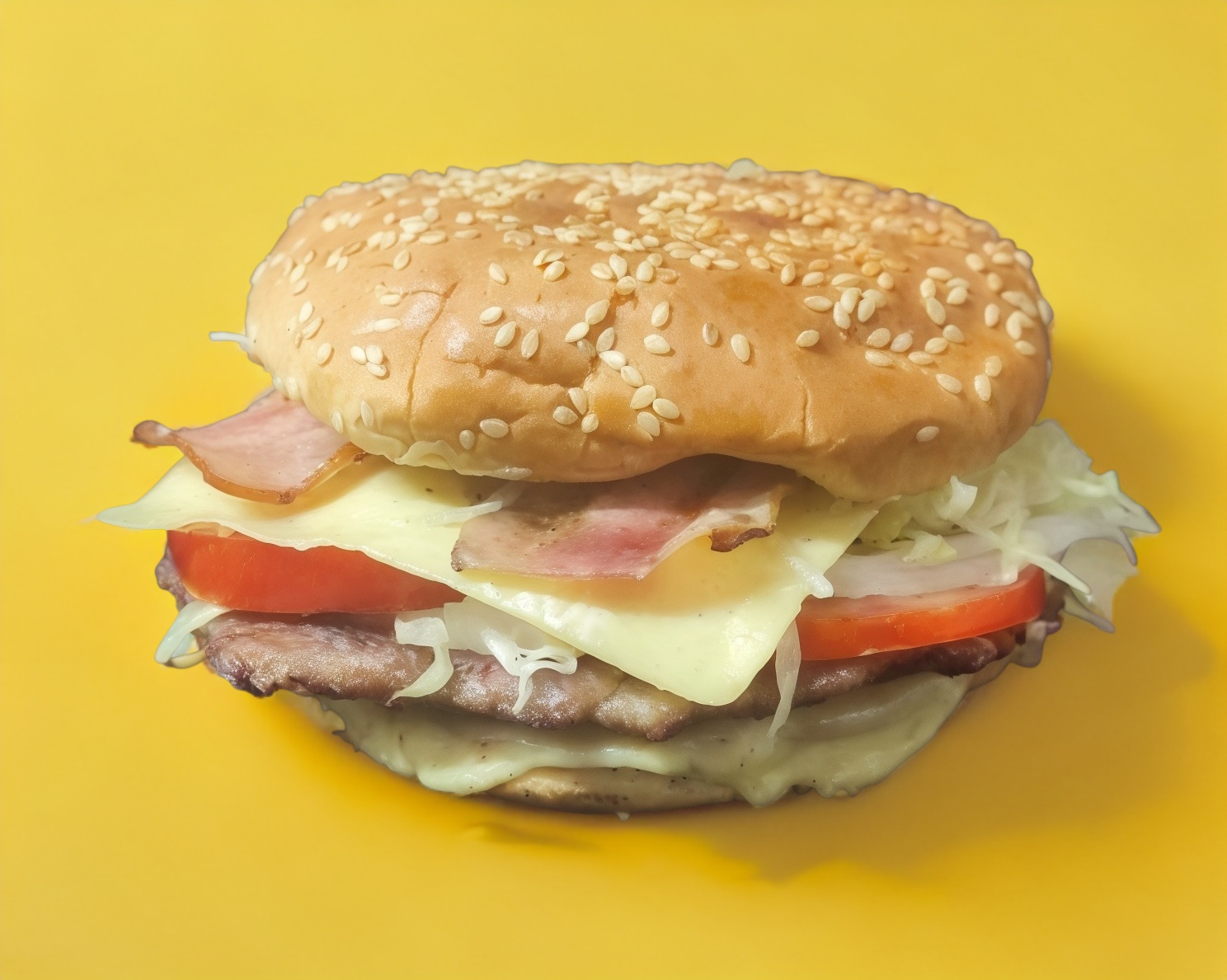 Hamburguesa con carne al carbón, pan tradicional, queso, tocino, jitomate, cebolla, chiles picados, cátsup y mostaza. Sin acompañantes