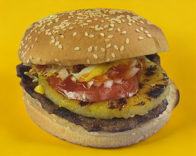 Hamburguesa con carne al carbón, queso, piña, tocino, jitomate, cebolla, chiles picados, cátsup y mostaza.
