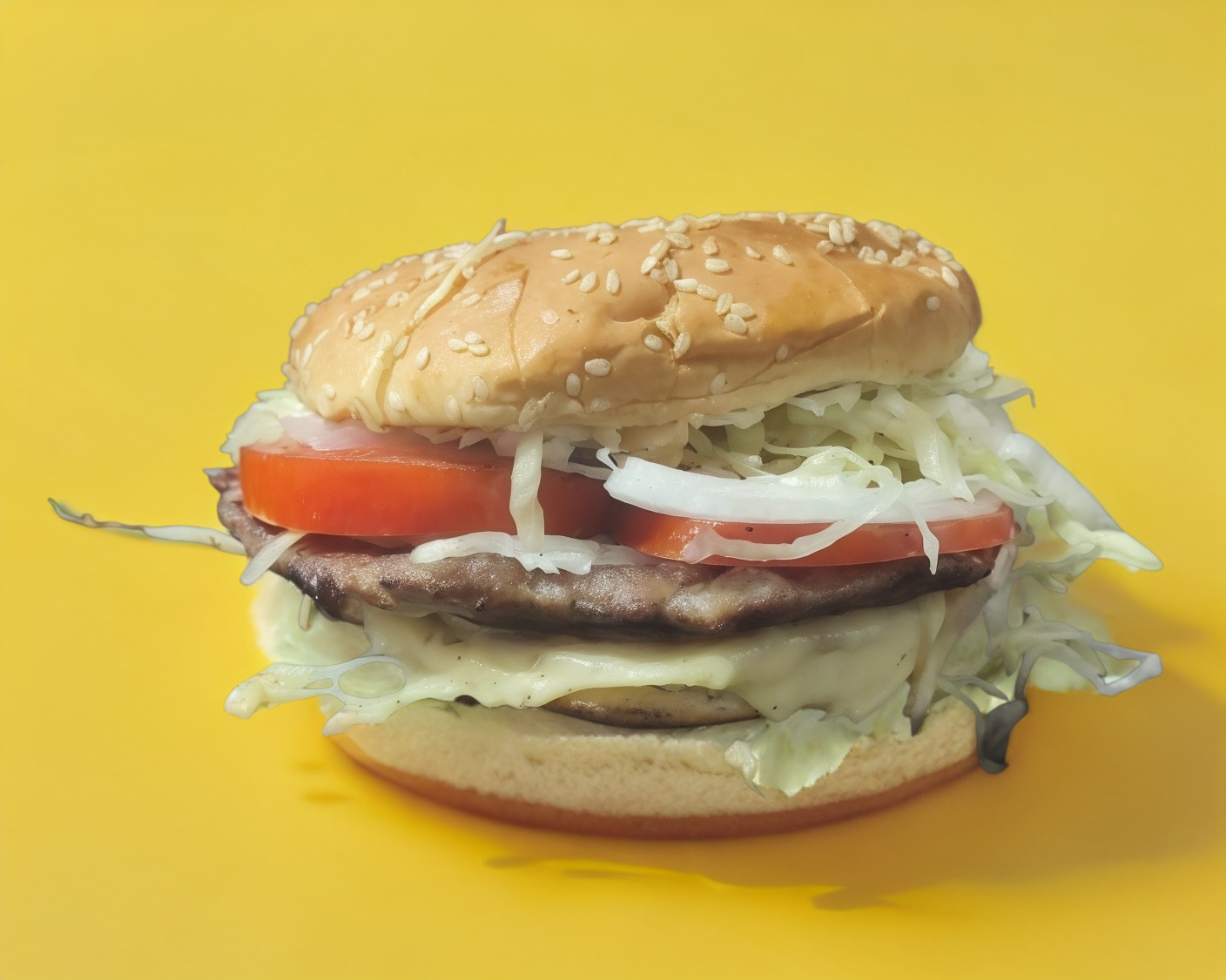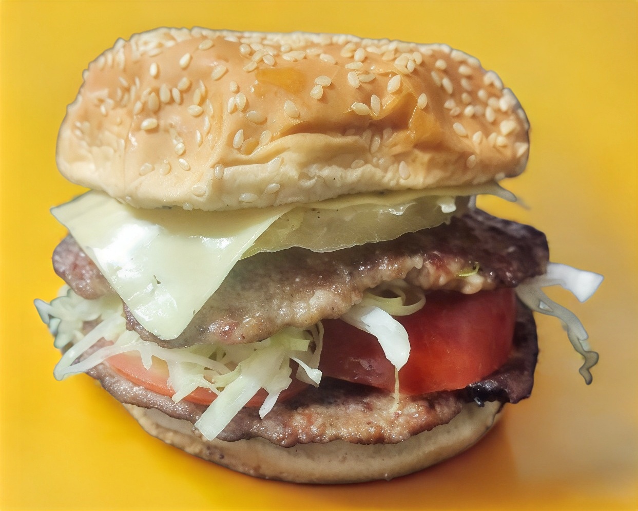 Hamburguesa con doble queso, carne al carbón, jitomate, cebolla, chiles picados, cátsup y mostaza.