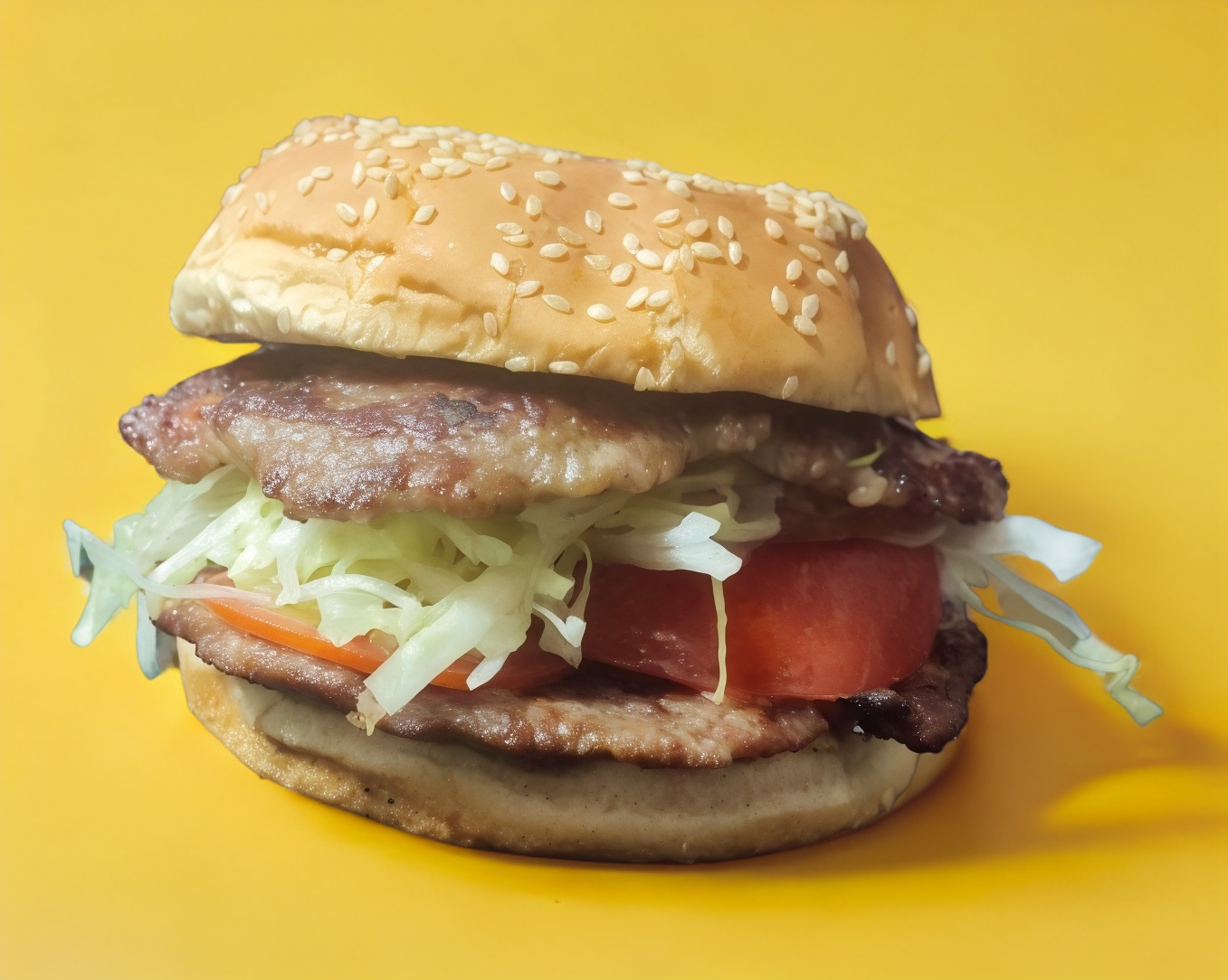 Hamburguesa con doble carne al carbón, jitomate, cebolla, chiles picados, cátsup y mostaza.