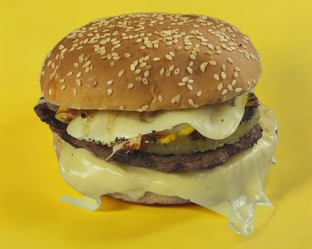 Hamburguesa con doble carne al carbón, queso, piña, tocino, jitomate, cebolla, chiles picados, cátsup y mostaza.