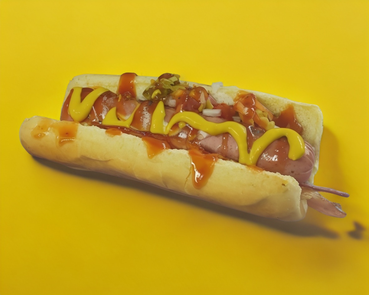 Hot dog con salchicha al carbón, tocino, jitomate, cebolla, rajas, cátsup y mostaza. Sin bebida