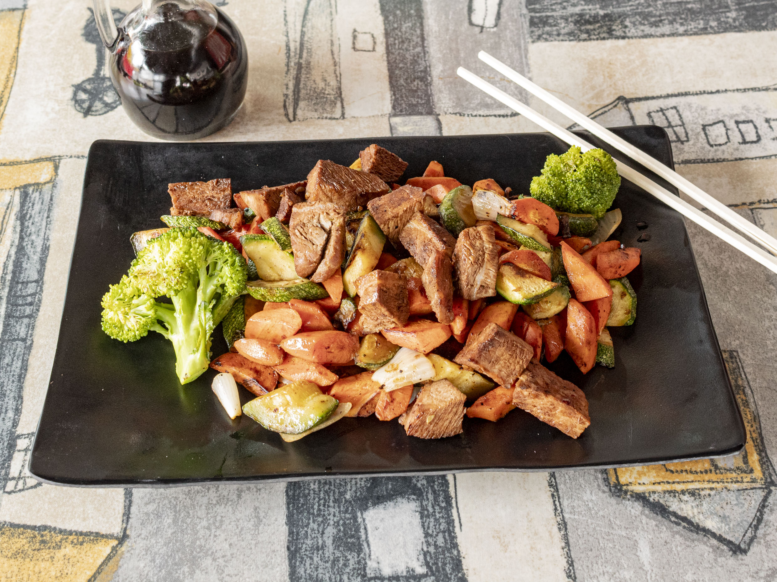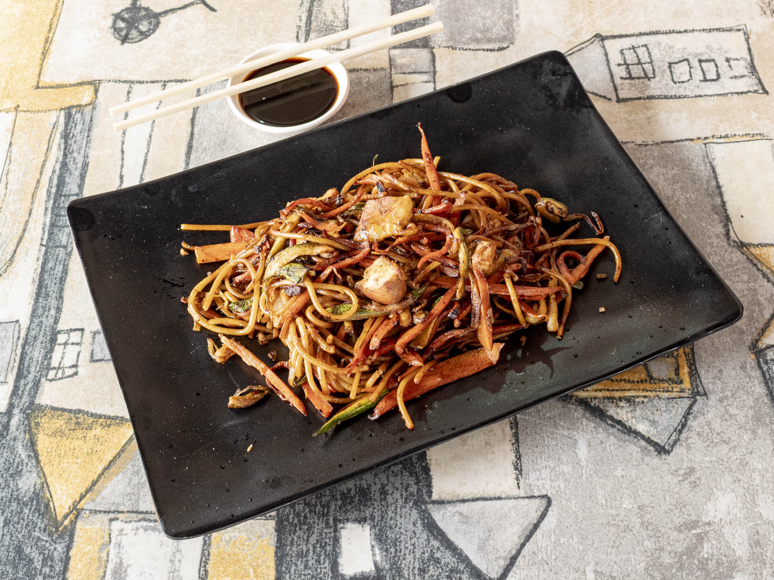 Tallarines a la plancha acompañados de verduras, pollo y calamar, bañados en salsa teriyaki.