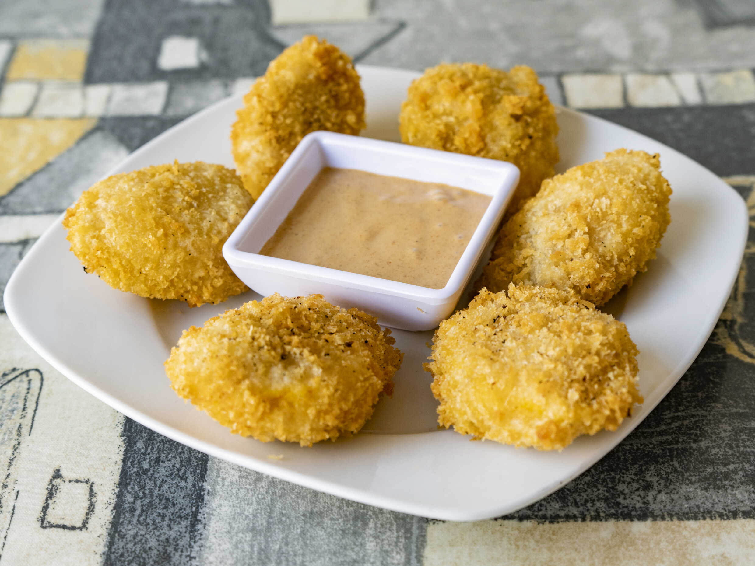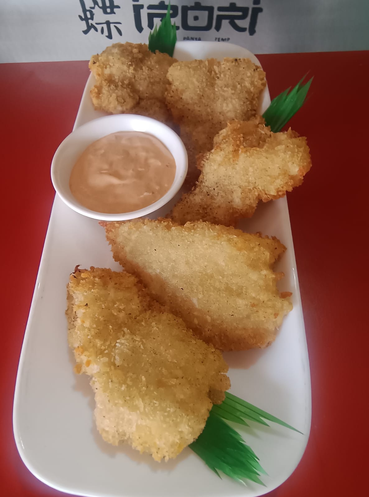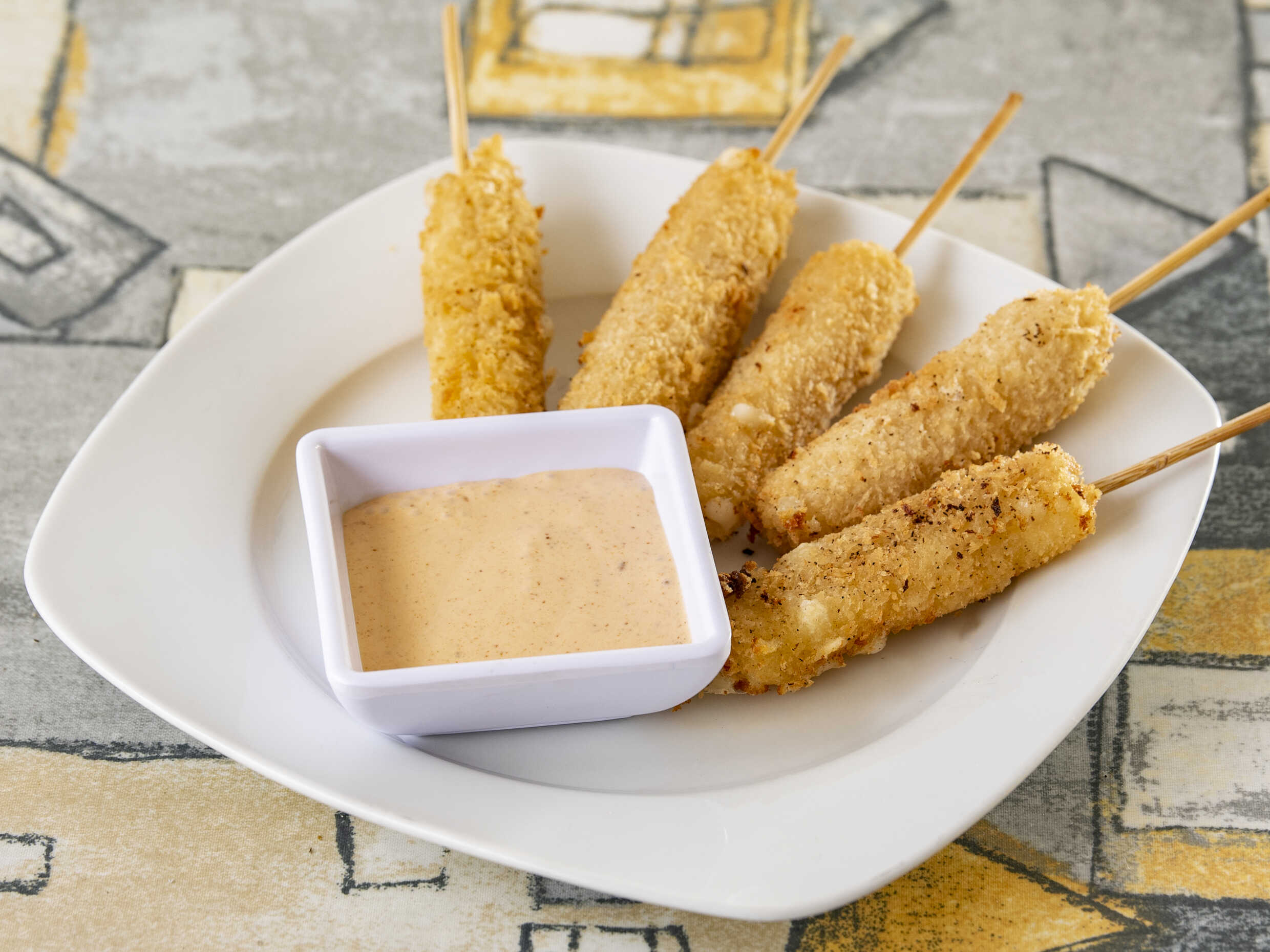 Camarones con queso philadelphia, empanizado con perlas de arroz, acompañado de salsa tamarindo. 4 piezas.