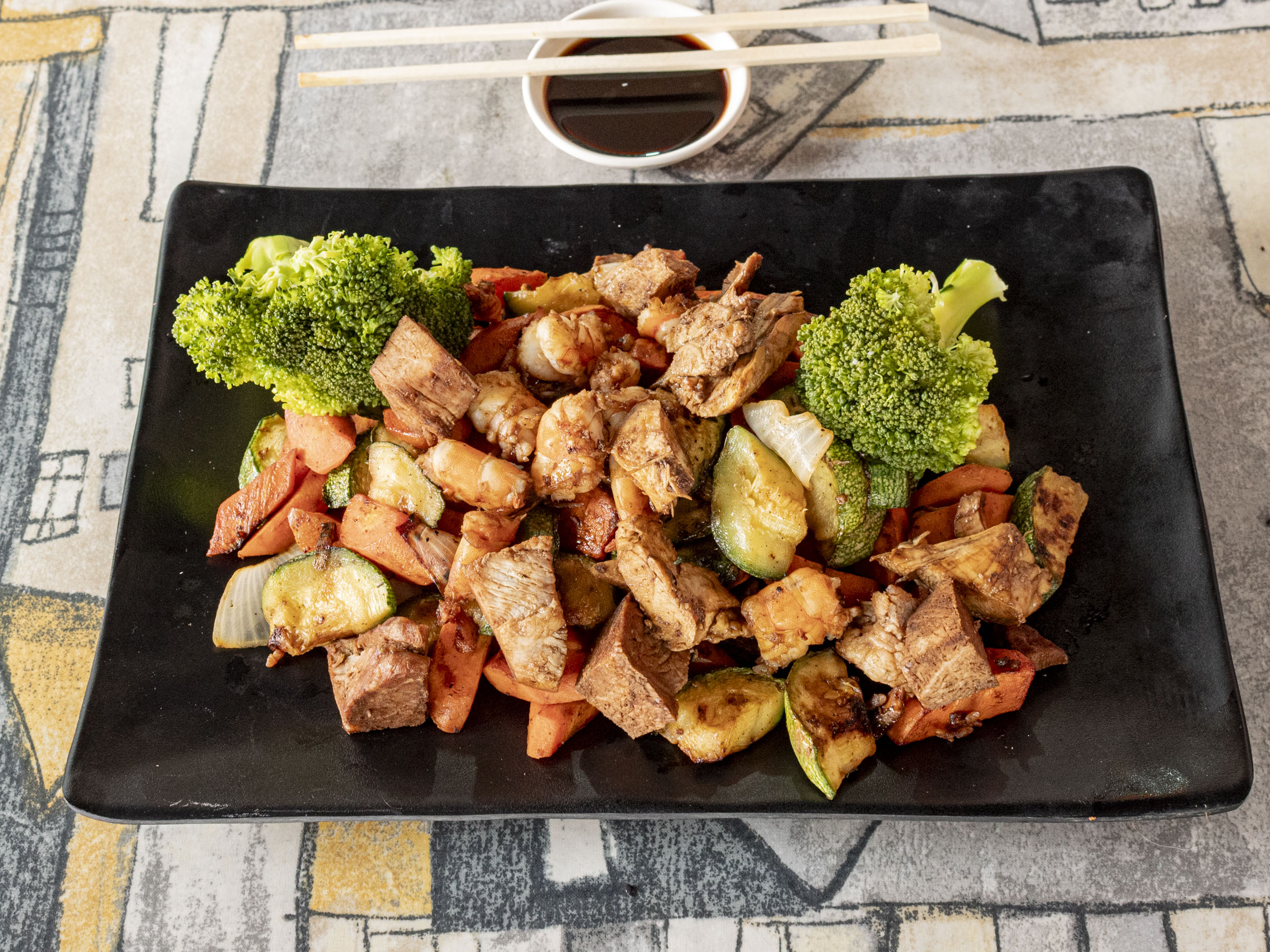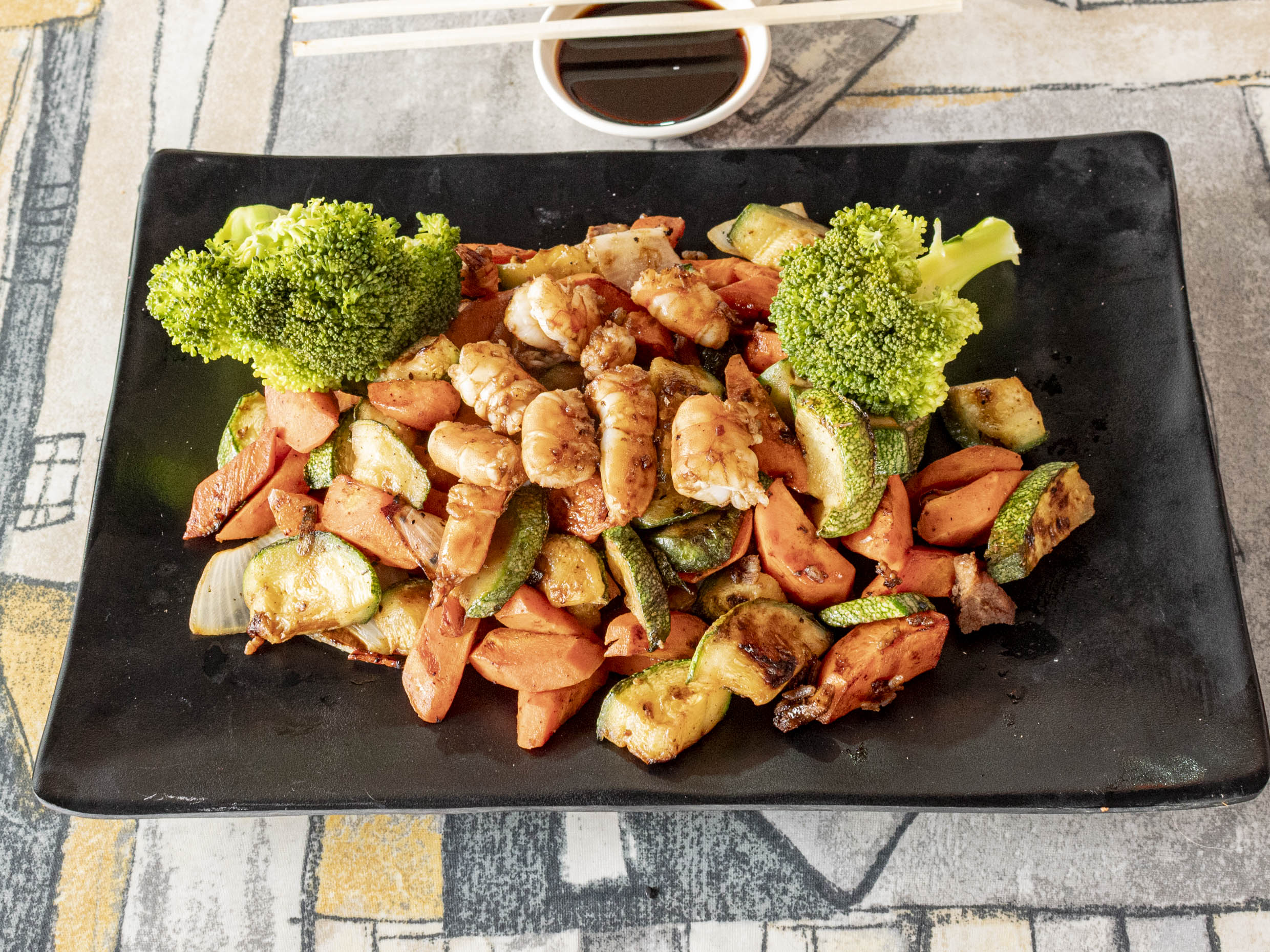 Verduras a la plancha acompañadas de pollo, arrachera y camarón.