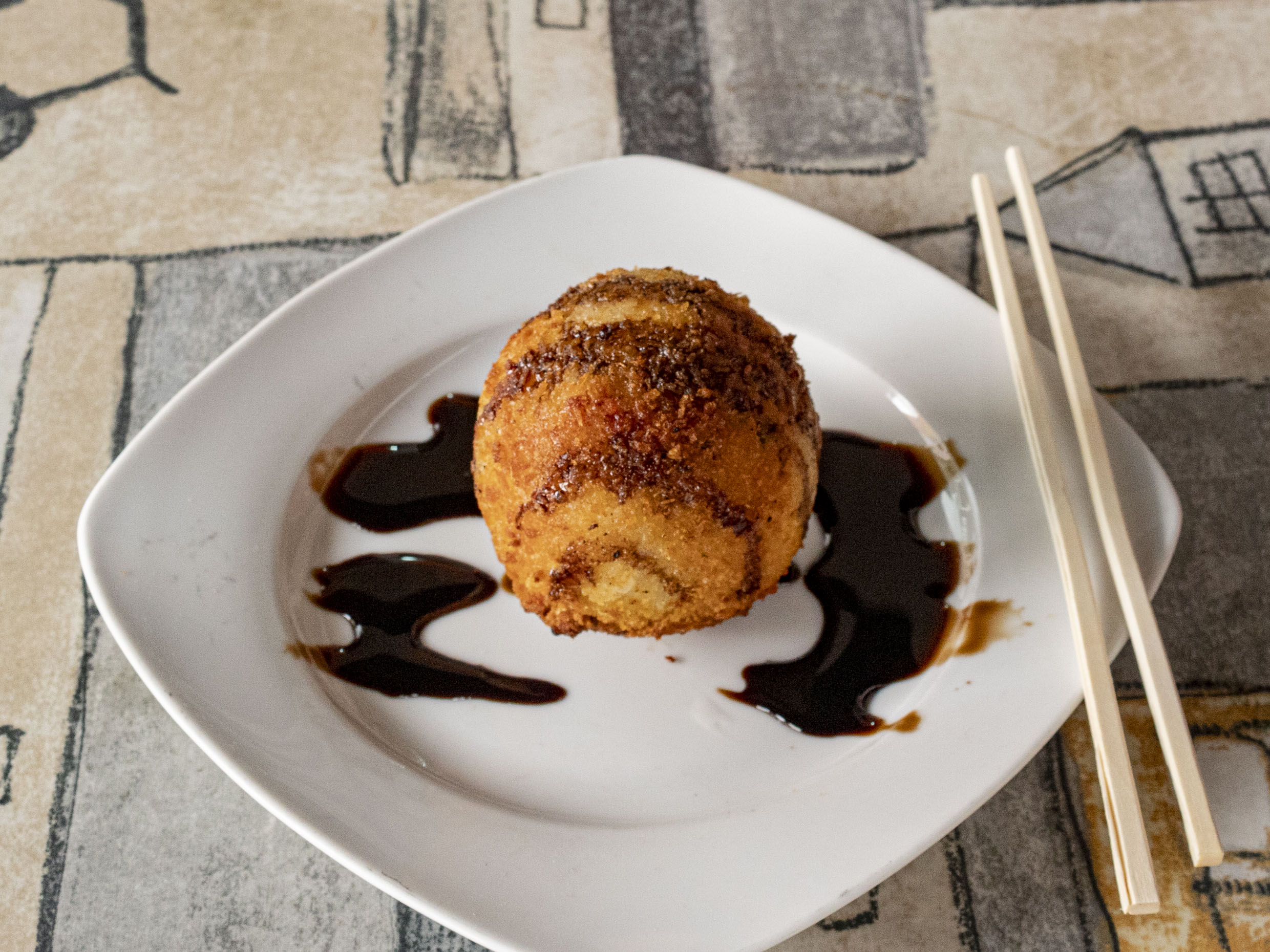 Bola de arroz rellena de philadelphia, camarón, aguacate y tampico. Empanizado con perlas de arroz y bañado en salsa de anguila.