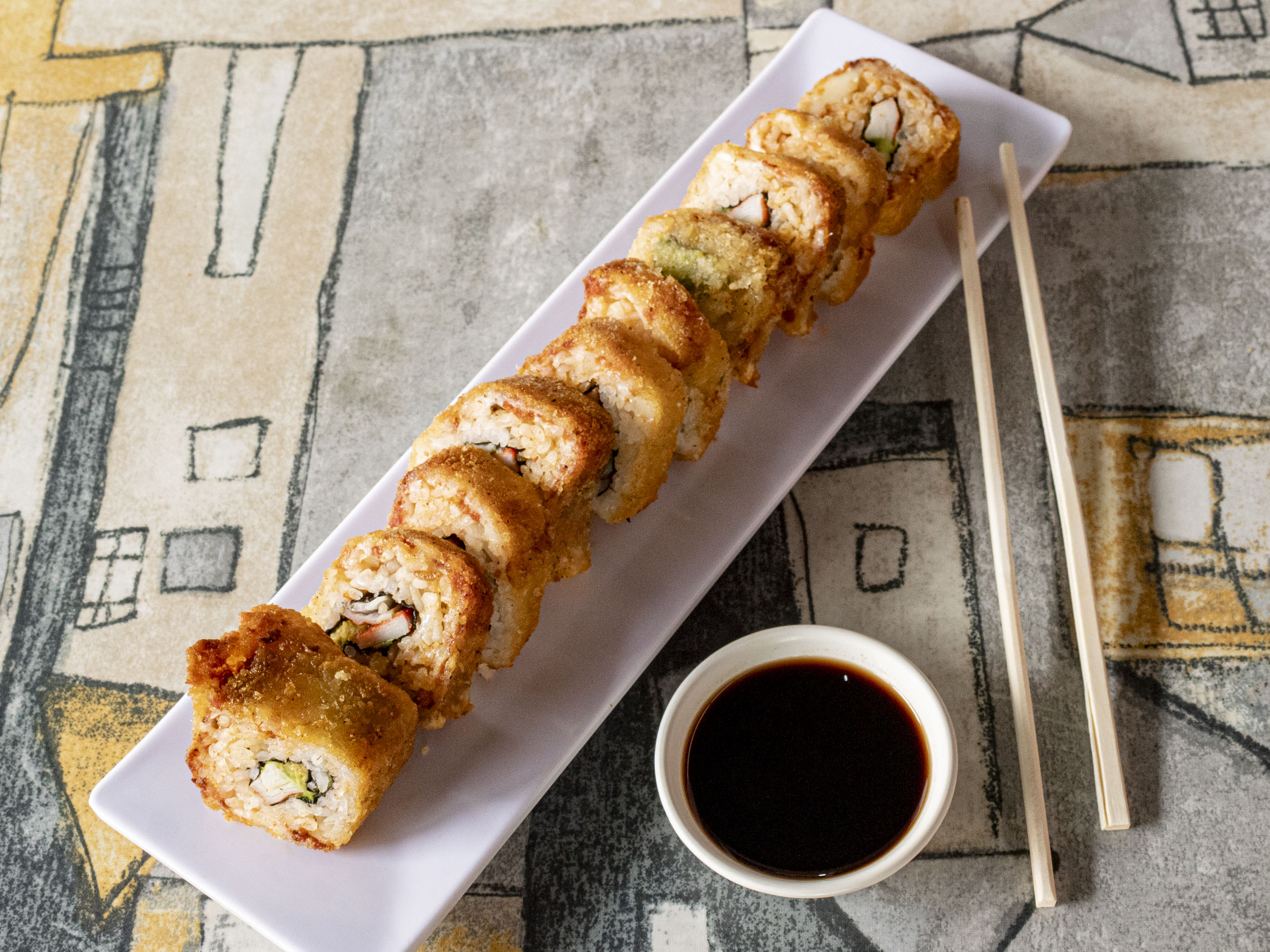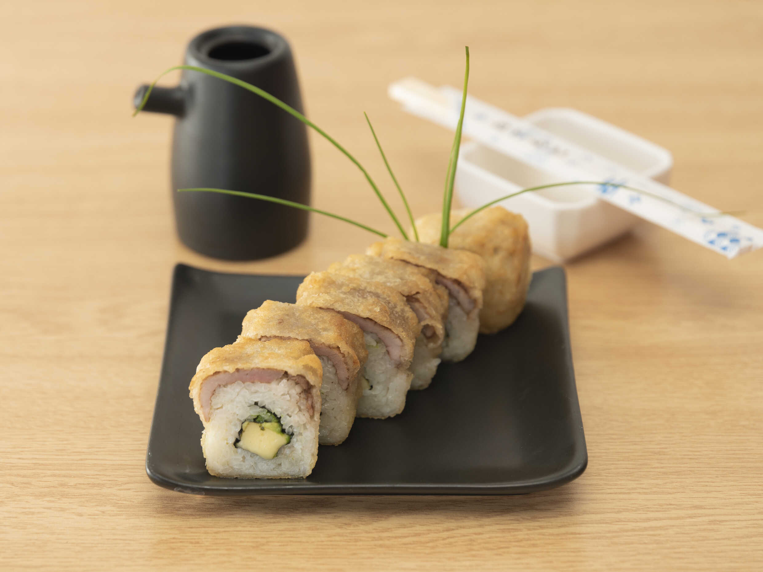 Camarón empanizado, philadelphia y aguacate. Empanizado con perlas de arroz, acompañado con salsa sriracha.