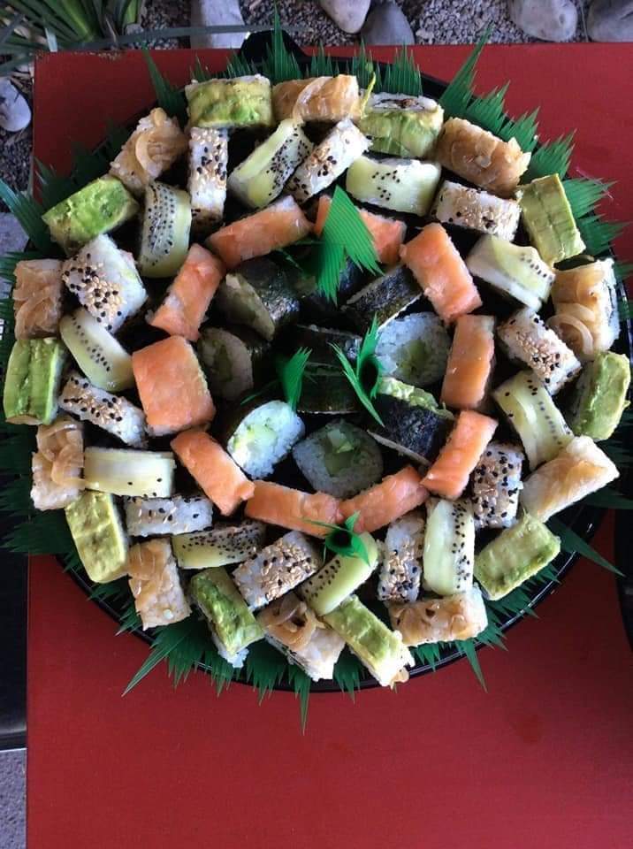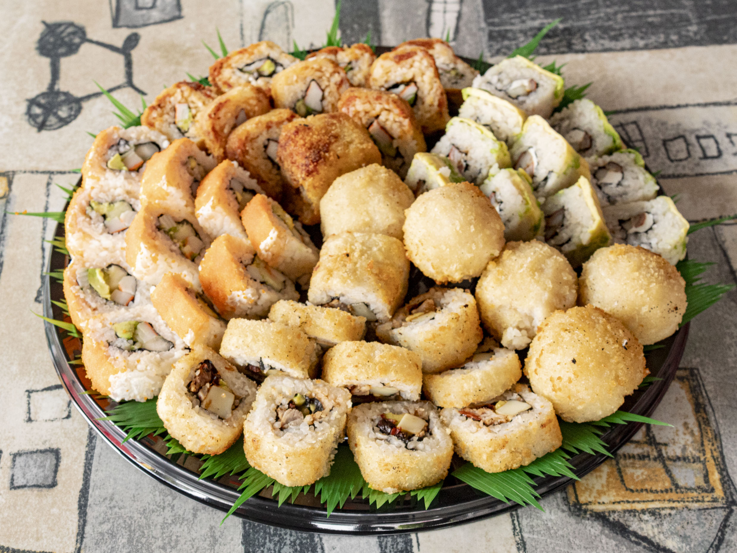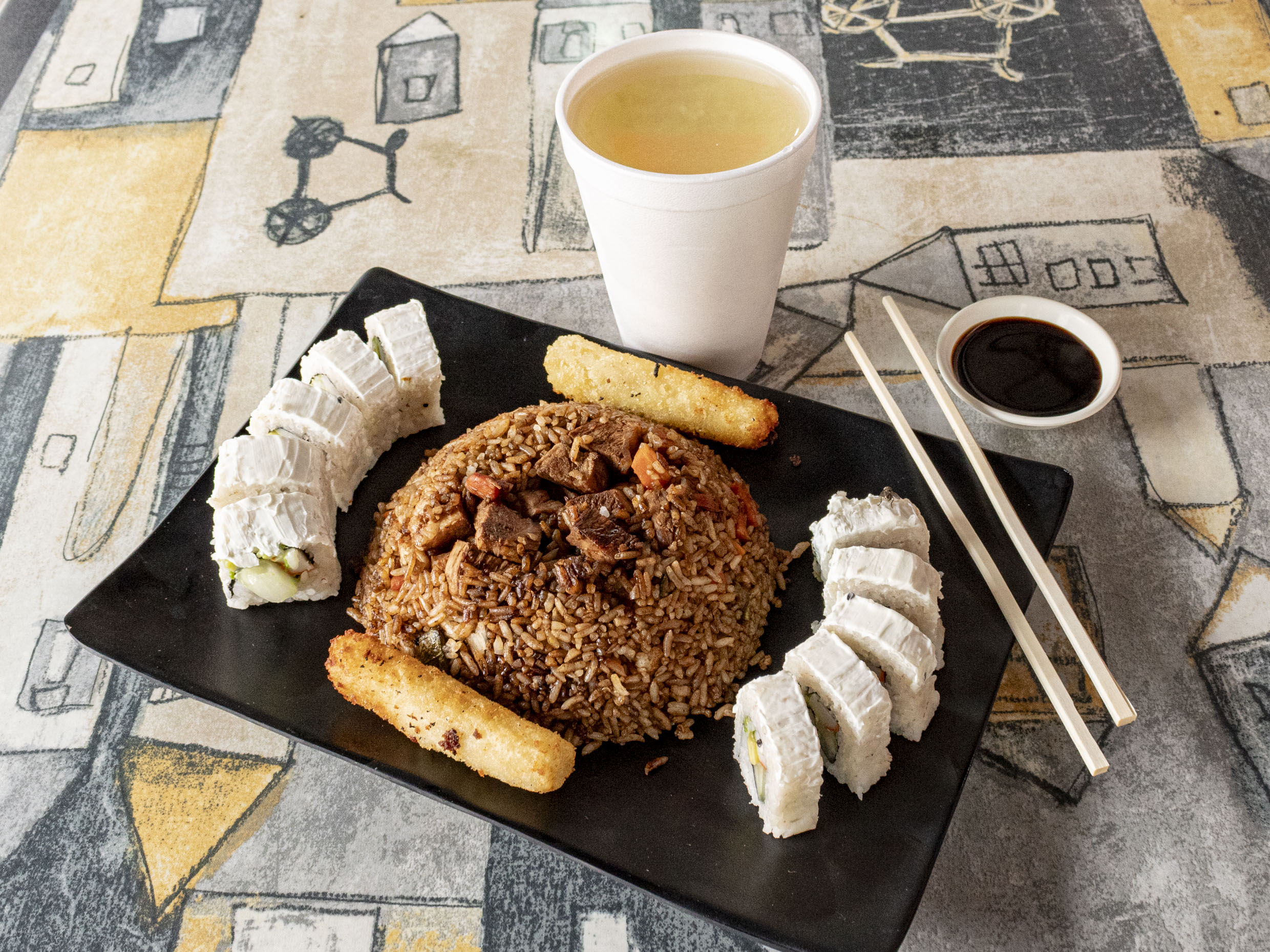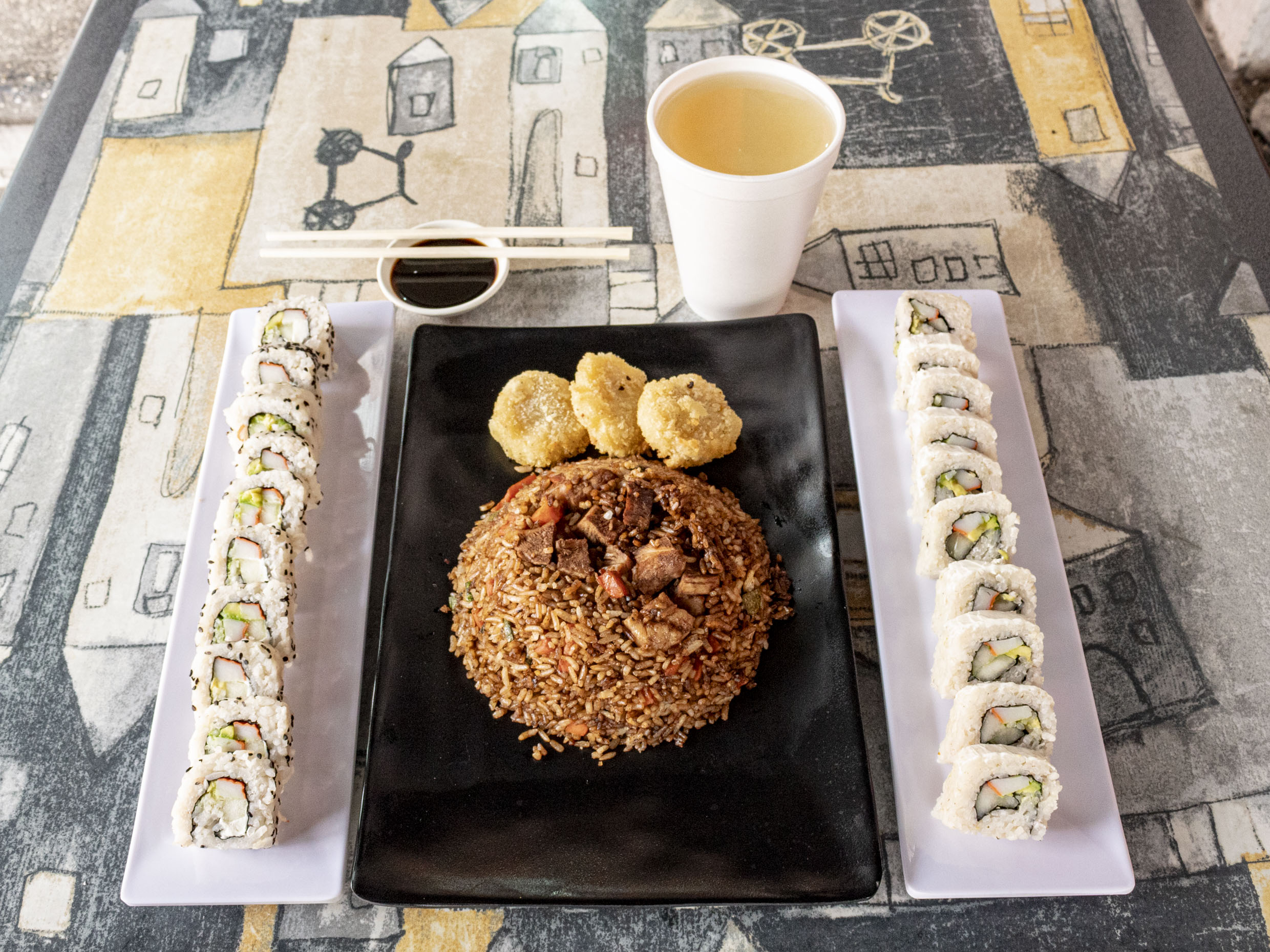 2 rollos tradicionales, 1 yakimeshi (pollo o carne), 2 piezas de kushiage de platano y 1 refresco de 400 ml.