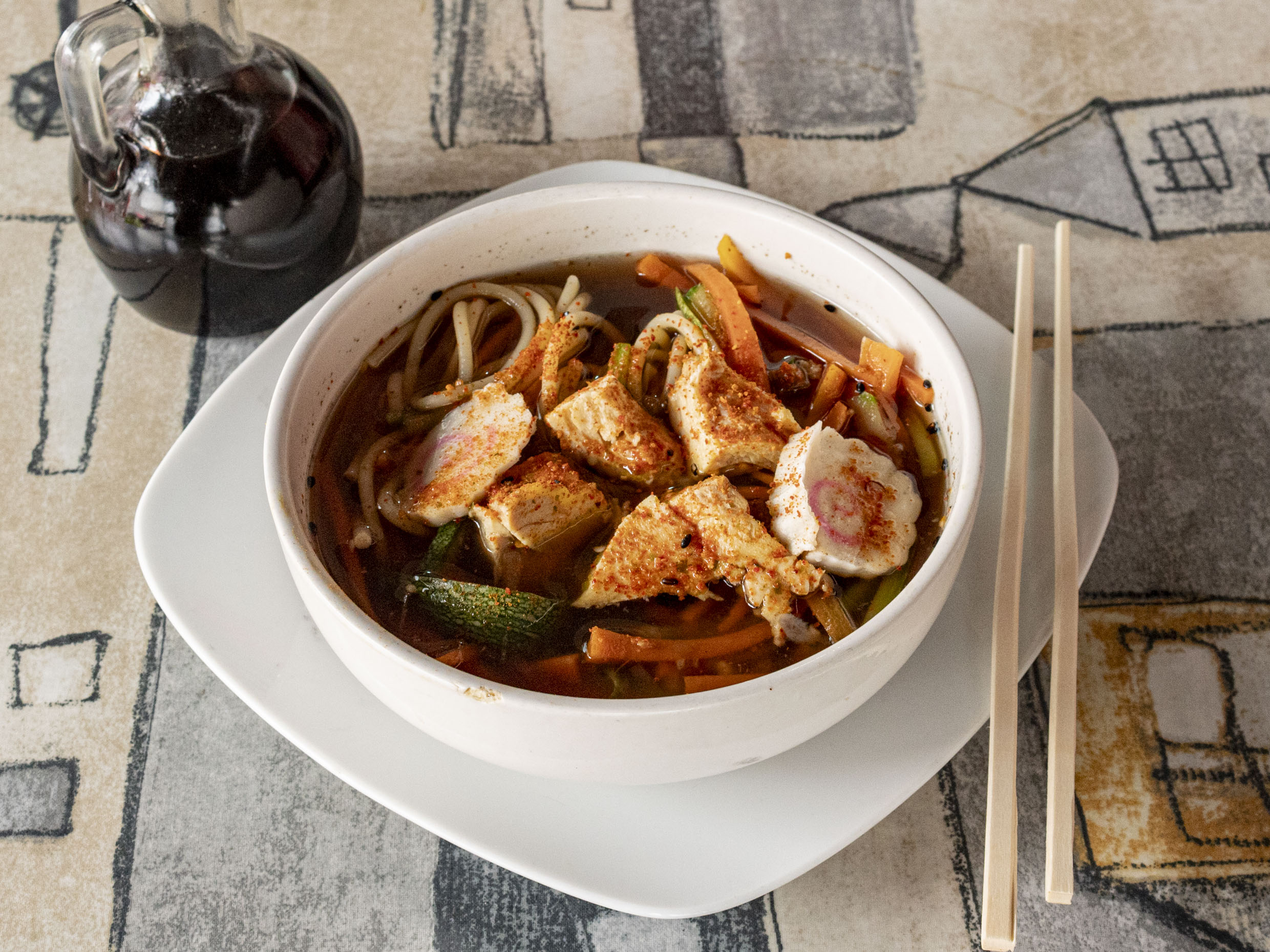 Tallarines a la plancha acompañados de verduras, camarón, pulpo y calamar, bañados en salsa teriyaki.