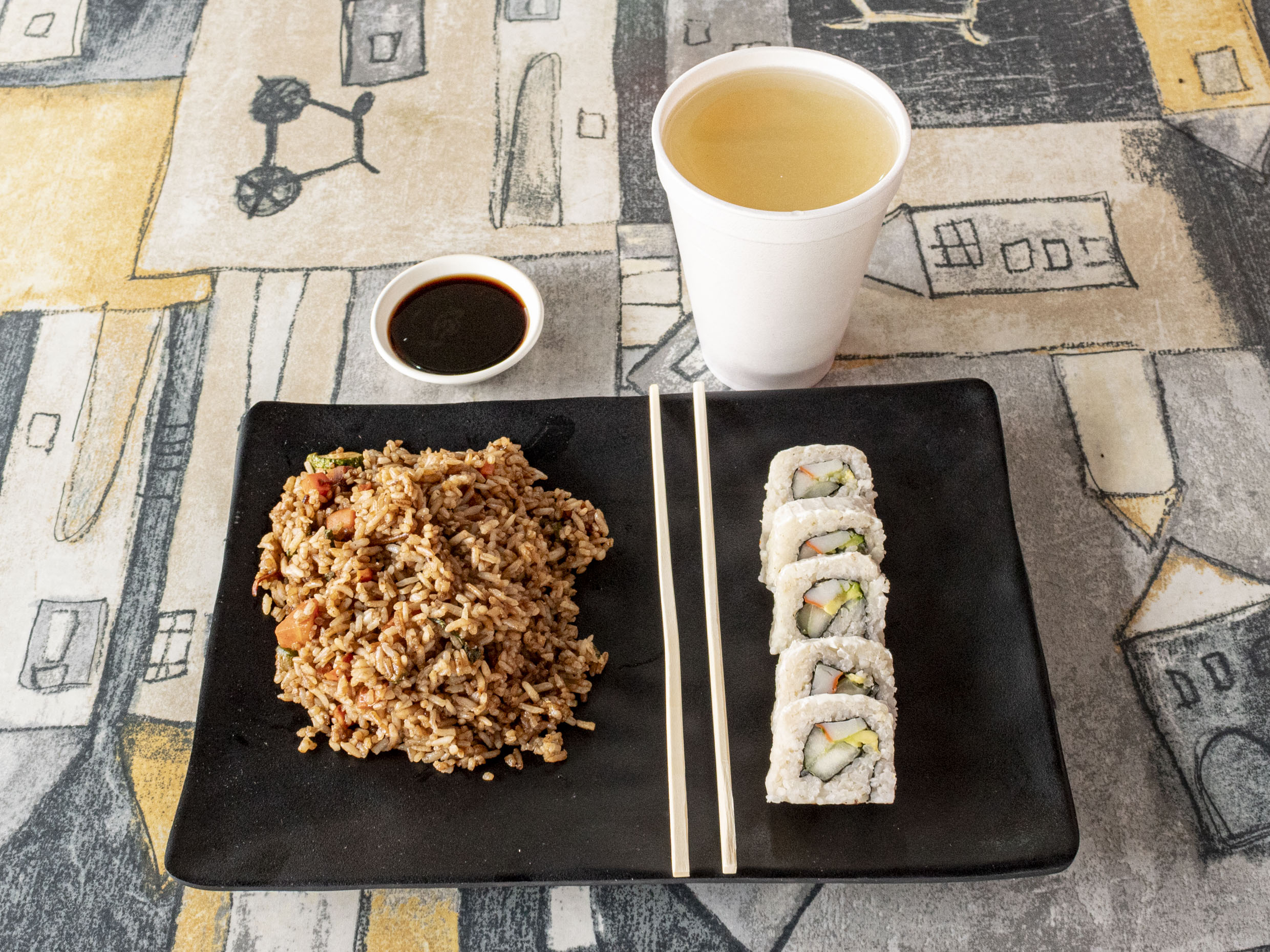 1/2 rollo a elección, 1/2 yakimeshi y una bebida.