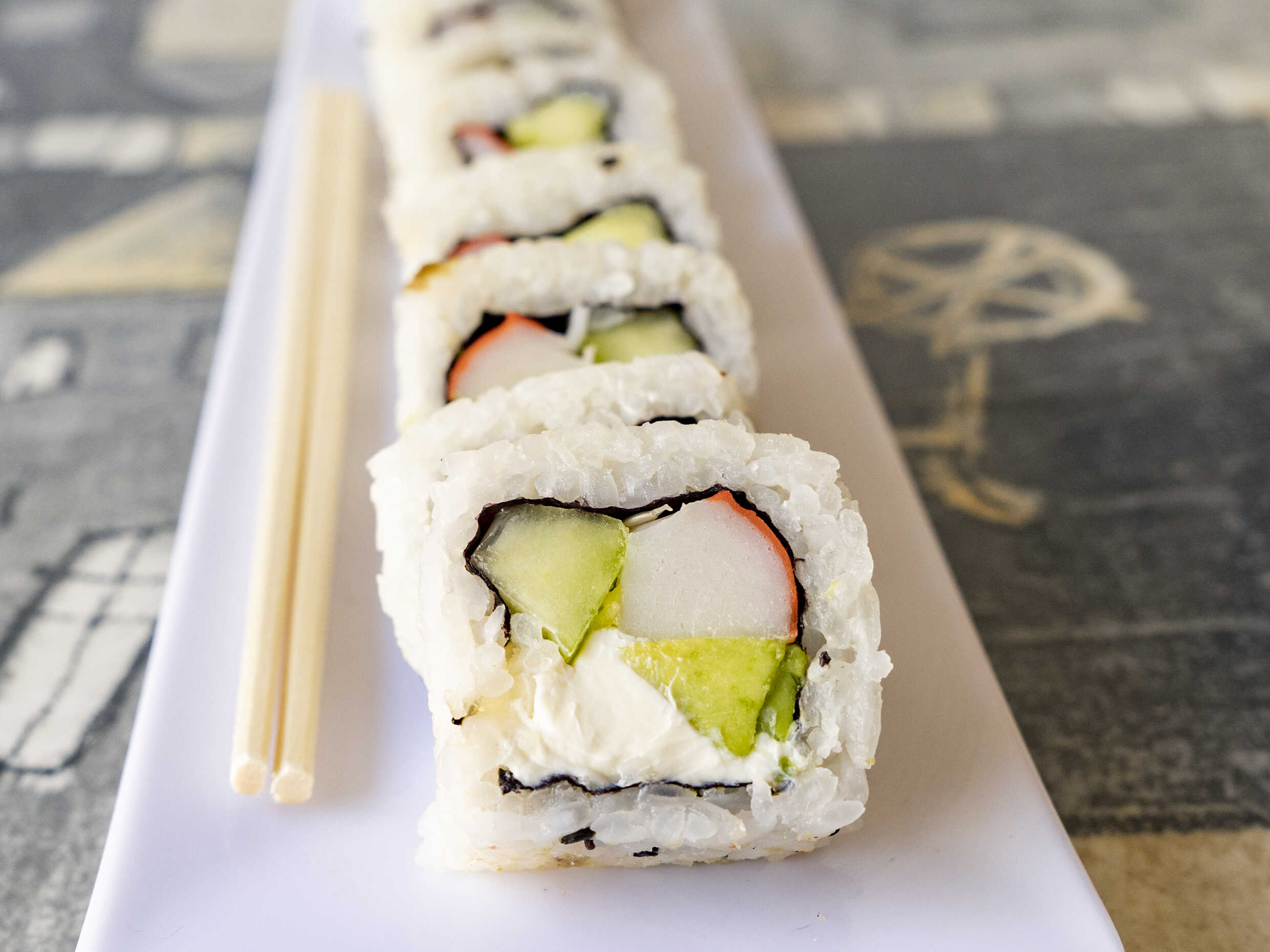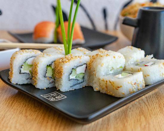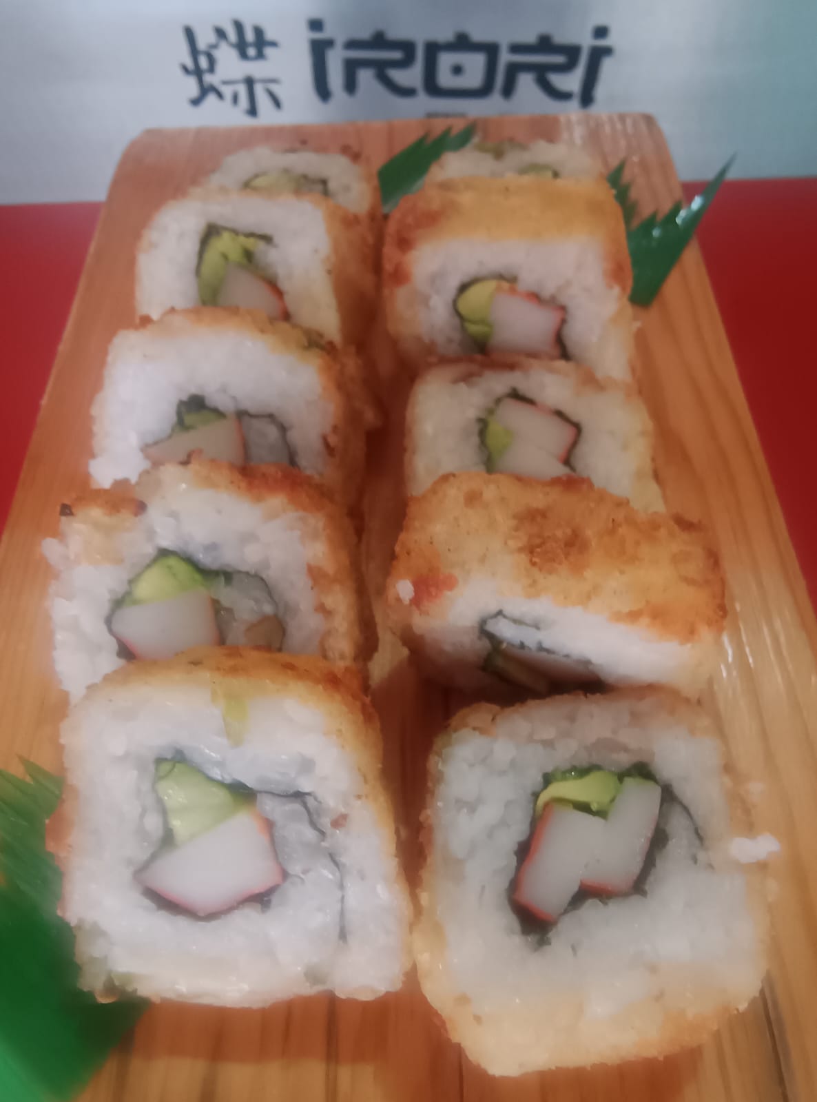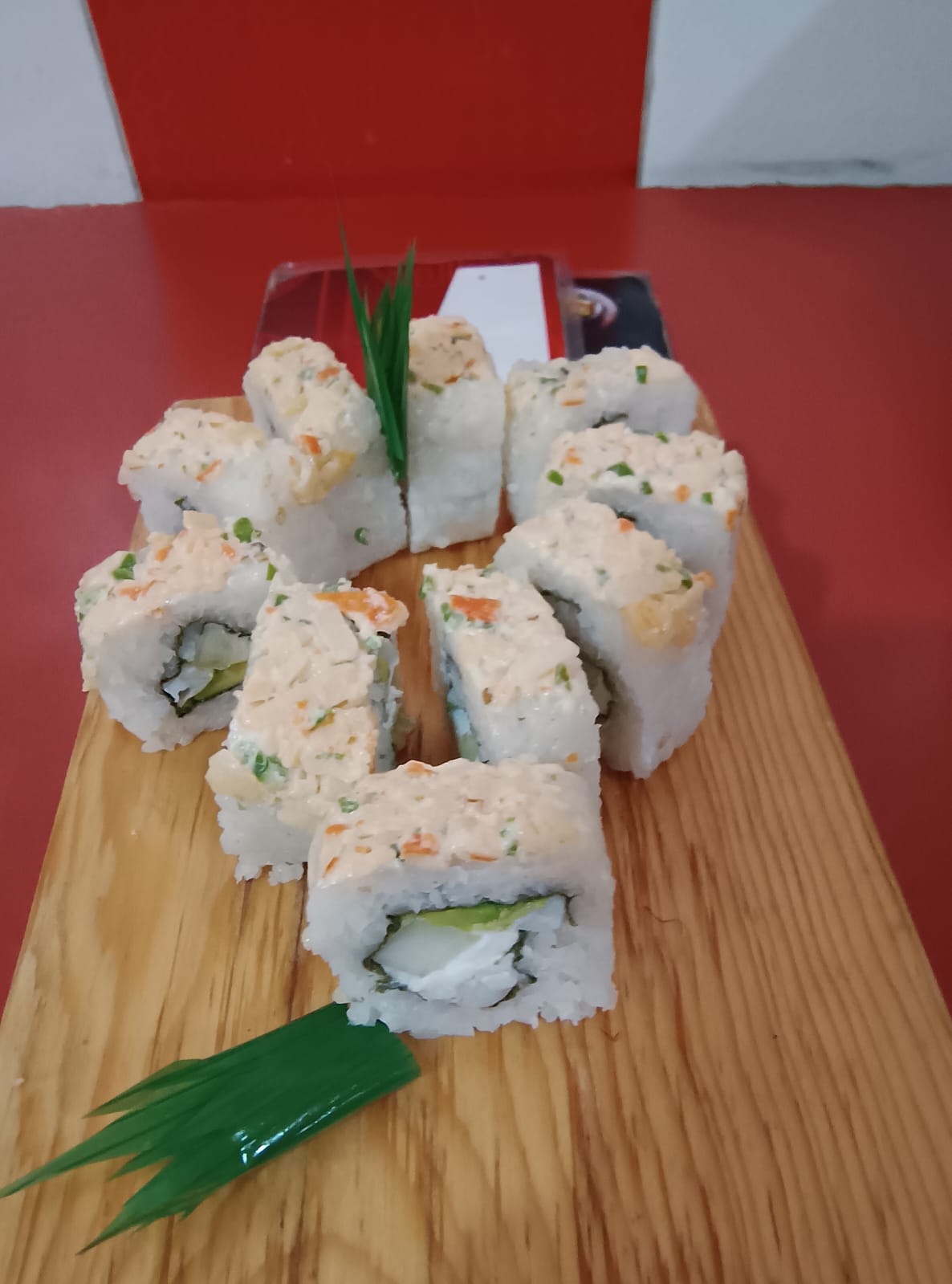 Cangrejo, pepino, queso, aguacate y camarón por fuera.