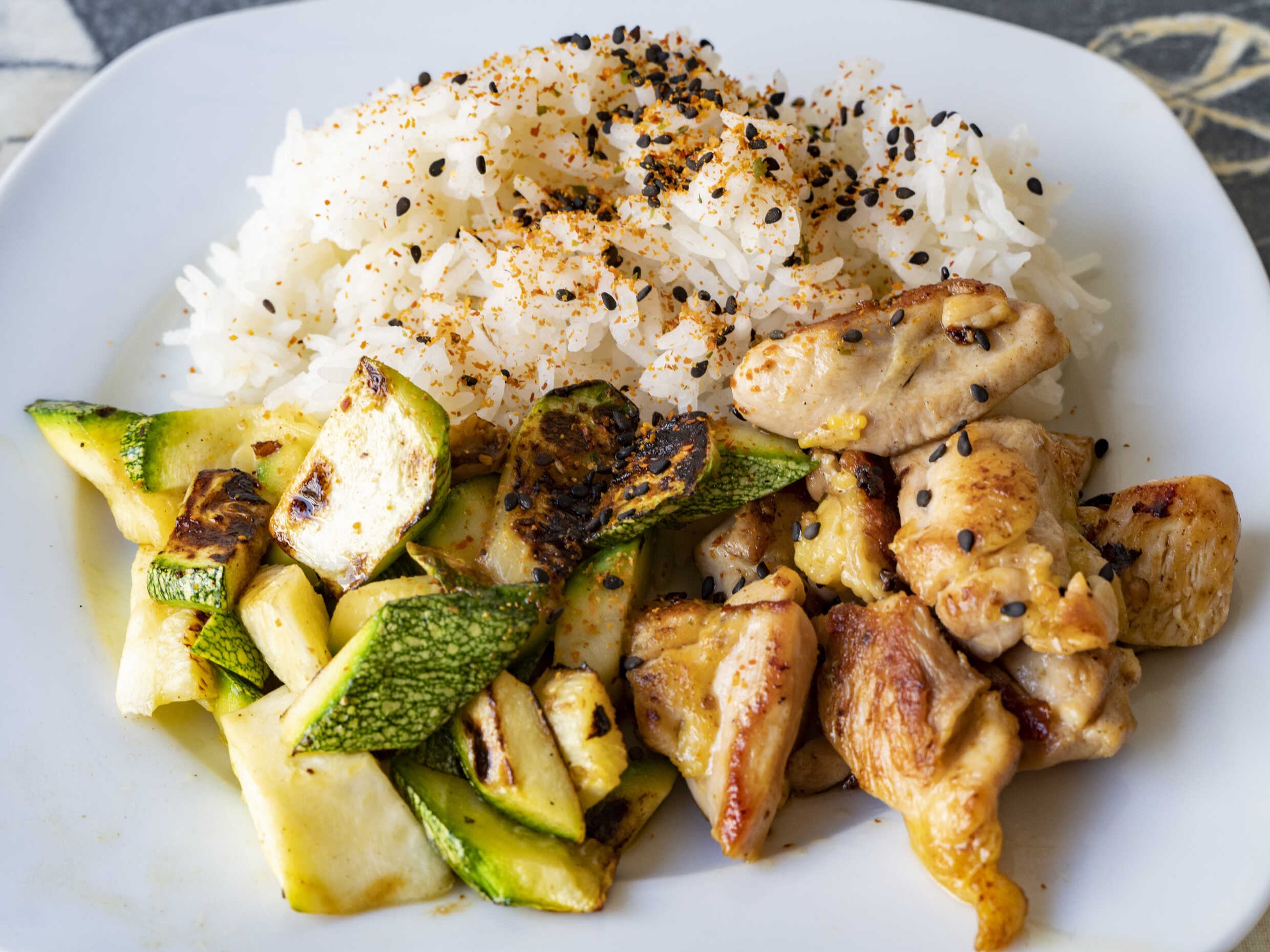 Arroz frito, zanahoria, calabaza, cebolla, pollo y arrachera.
