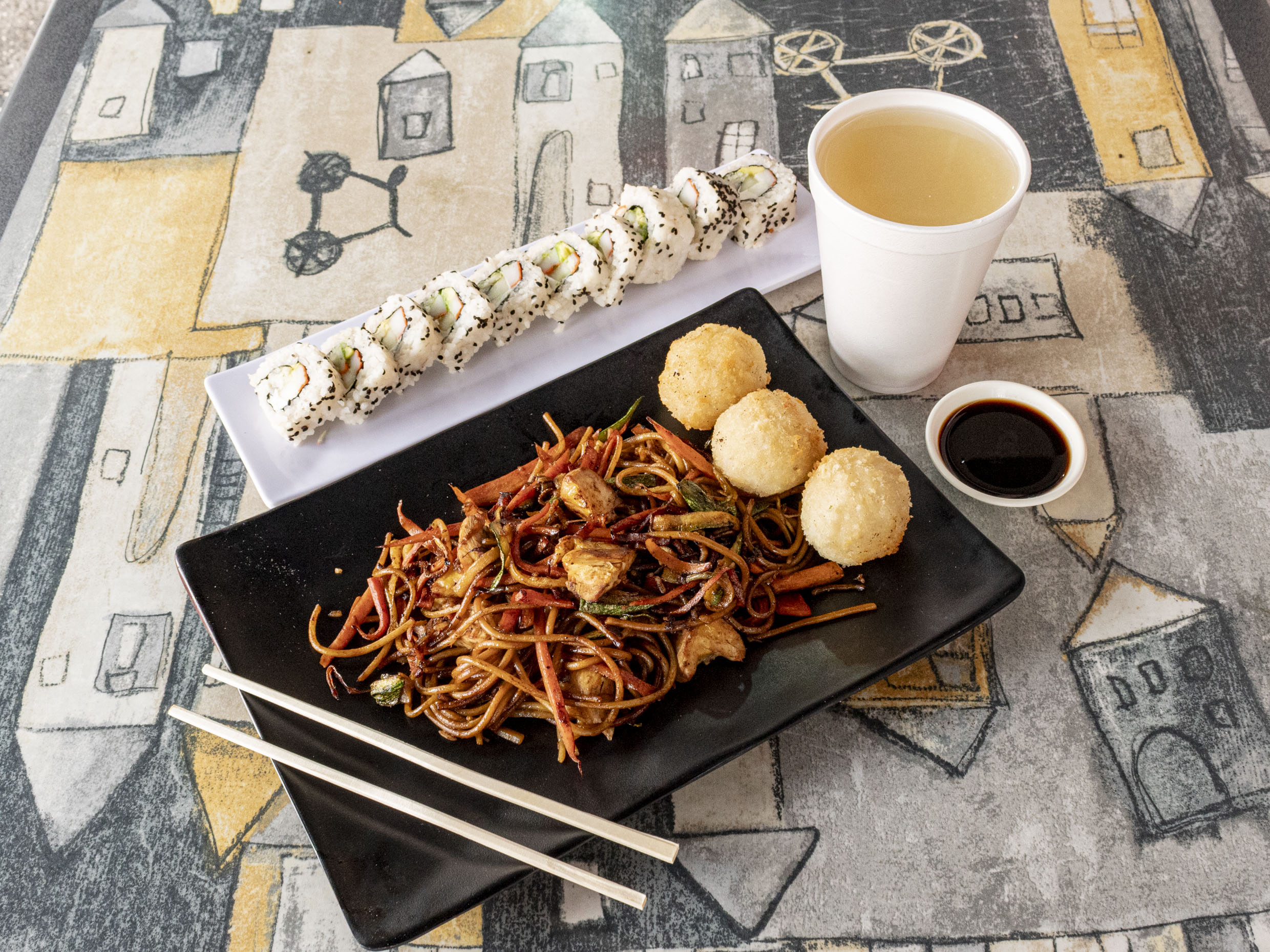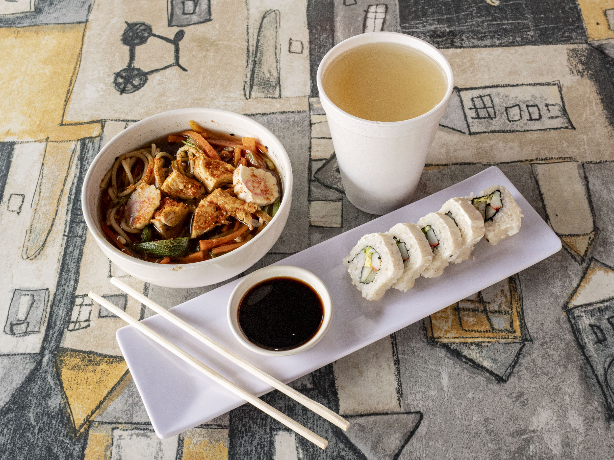 1/2 Yakiudon + 3 piezas de sushi pop + 1 rollo tradicional + 1 agua de 1/2 litro