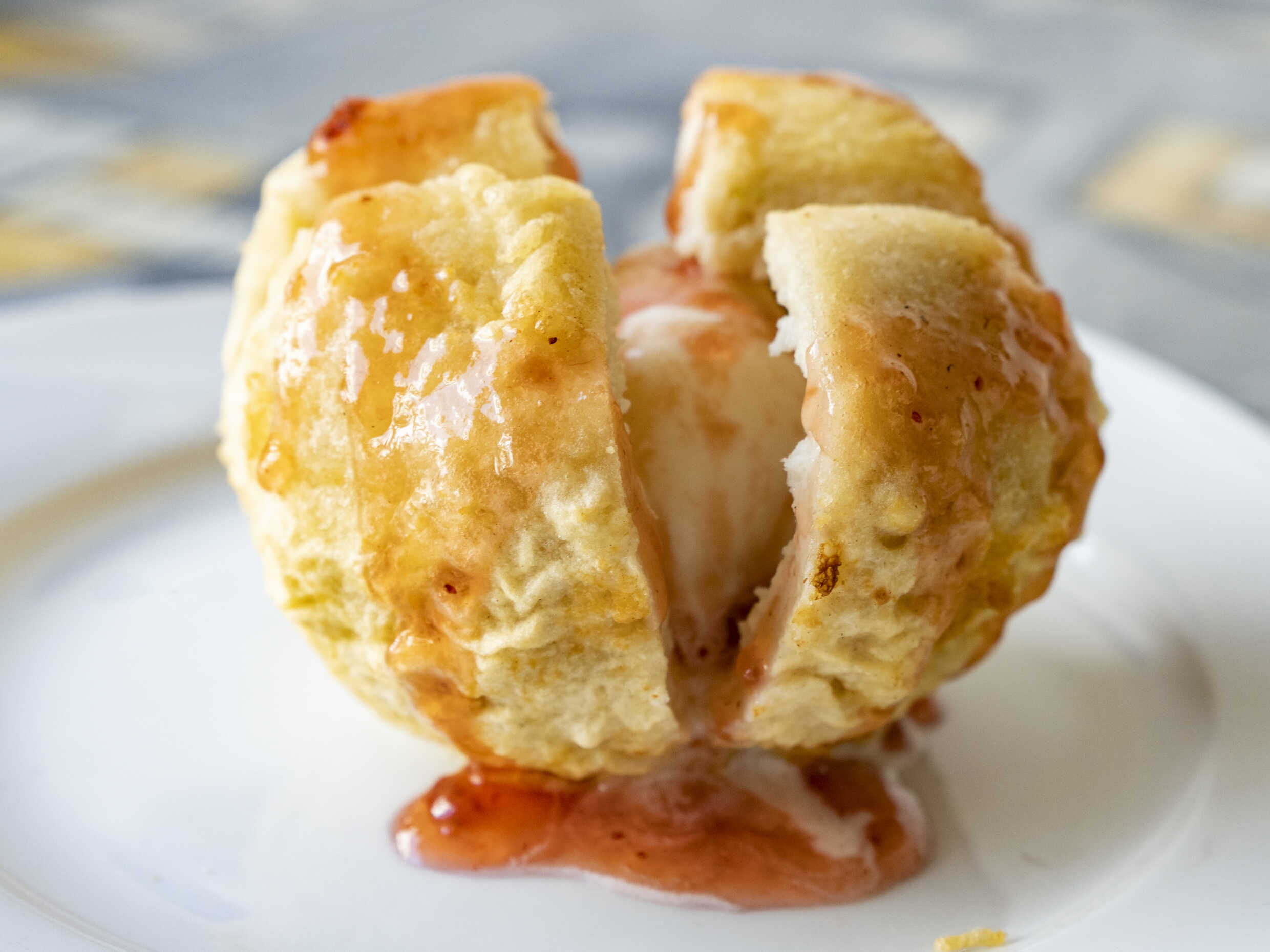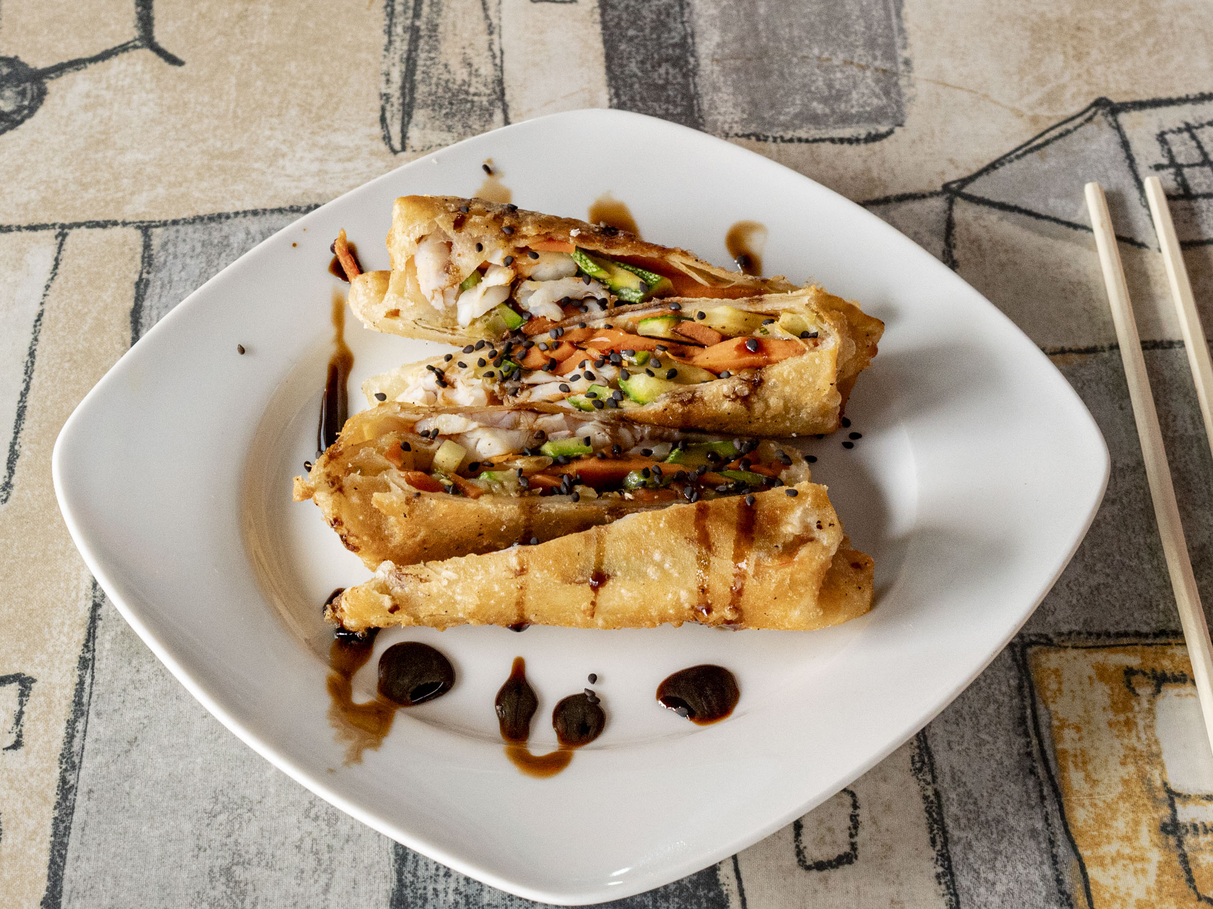 Rollito frito relleno de plátano, nuez y canela; acompañado de helado de coco y bañado en salsa maple.