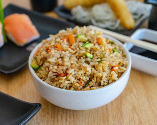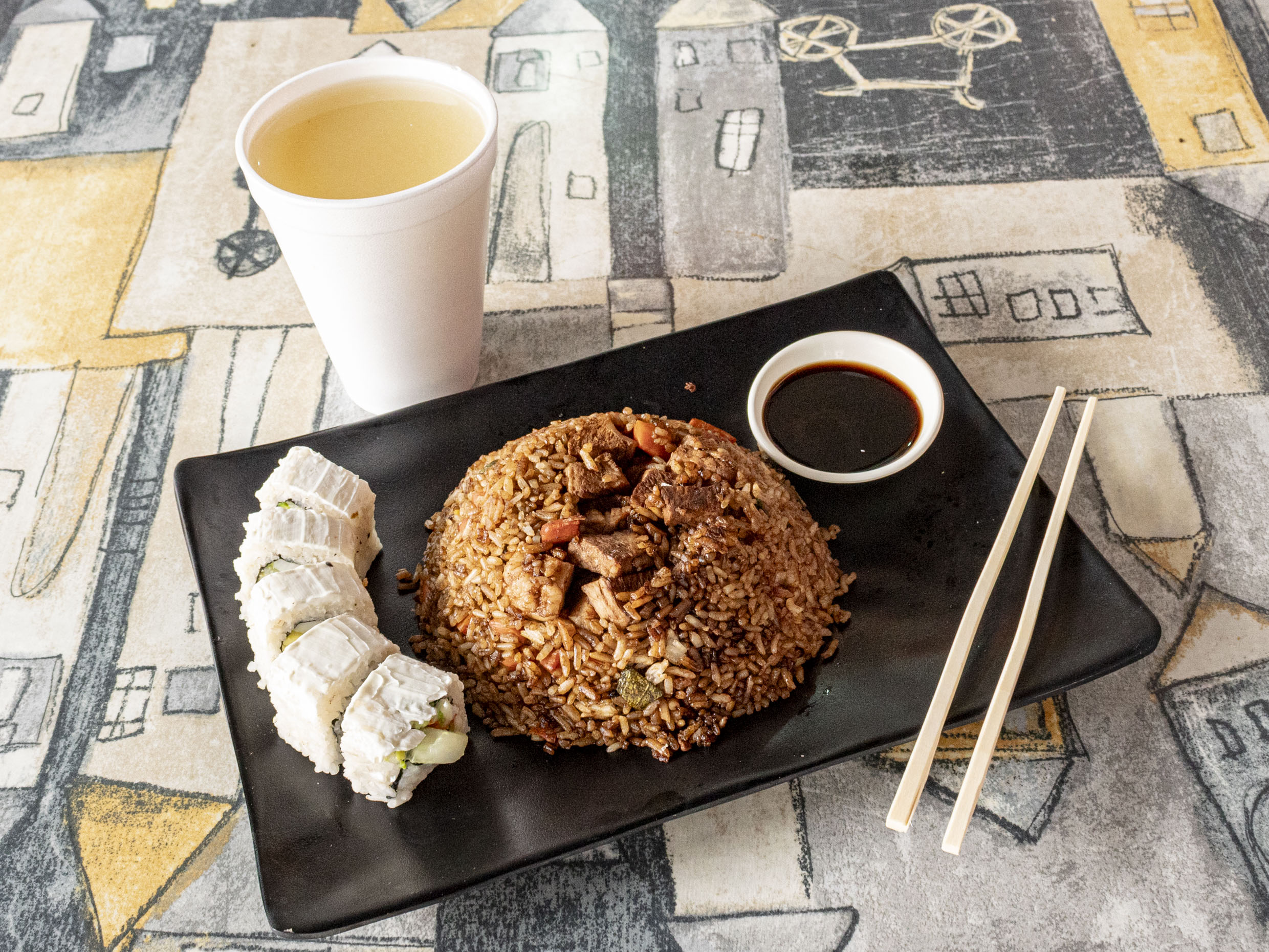 Arroz frito, zanahoria, calabaza, cebolla, pollo, arrachera, camarón y tampico.