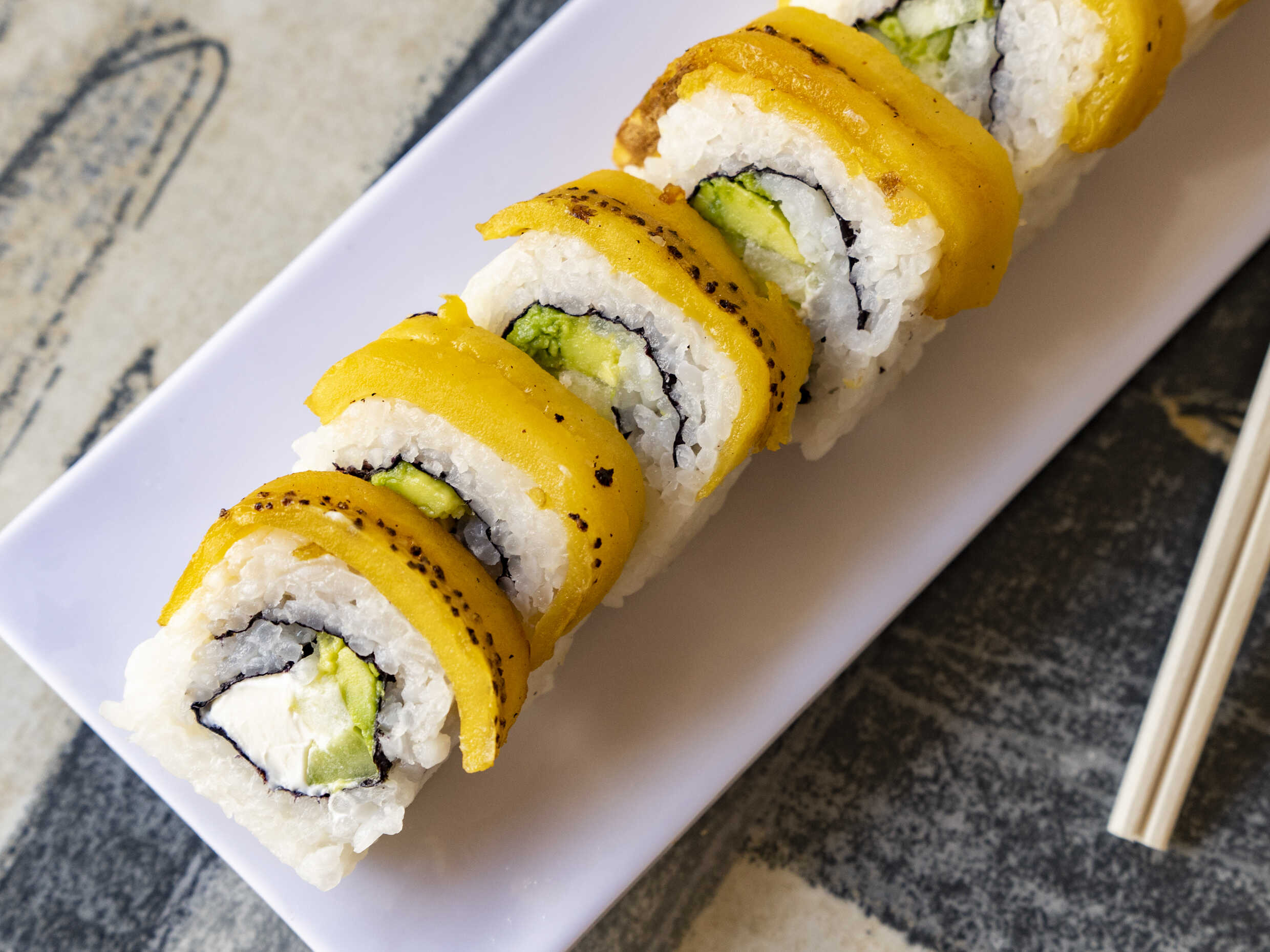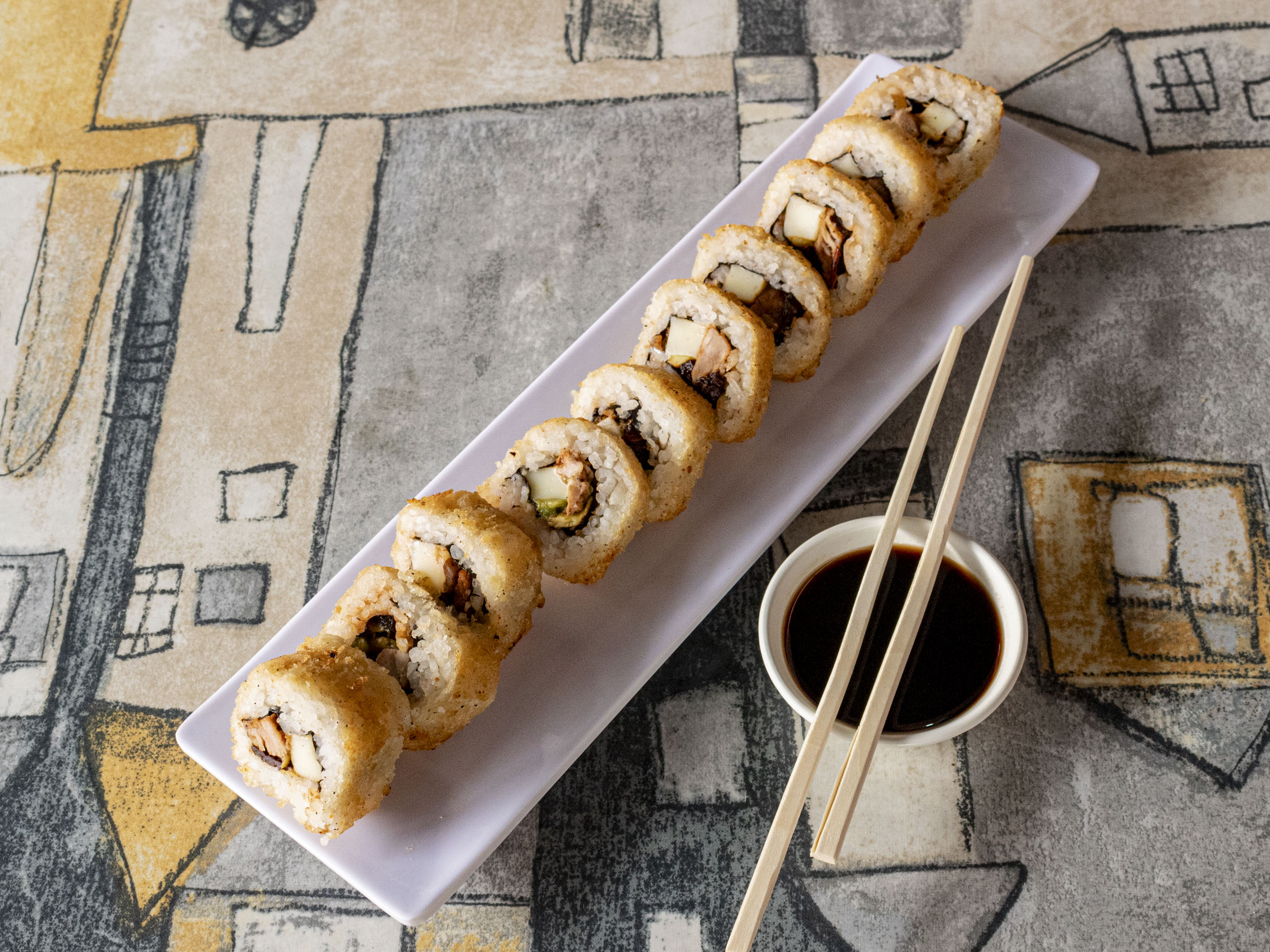 Masago, pepino, queso, aguacate, plátano frito por fuera