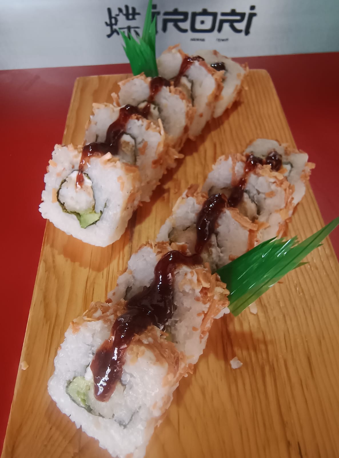 Camarón empanizado, aguacate, philadelphia, coco crocante por fuera y bañado en salsa de tamarindo.