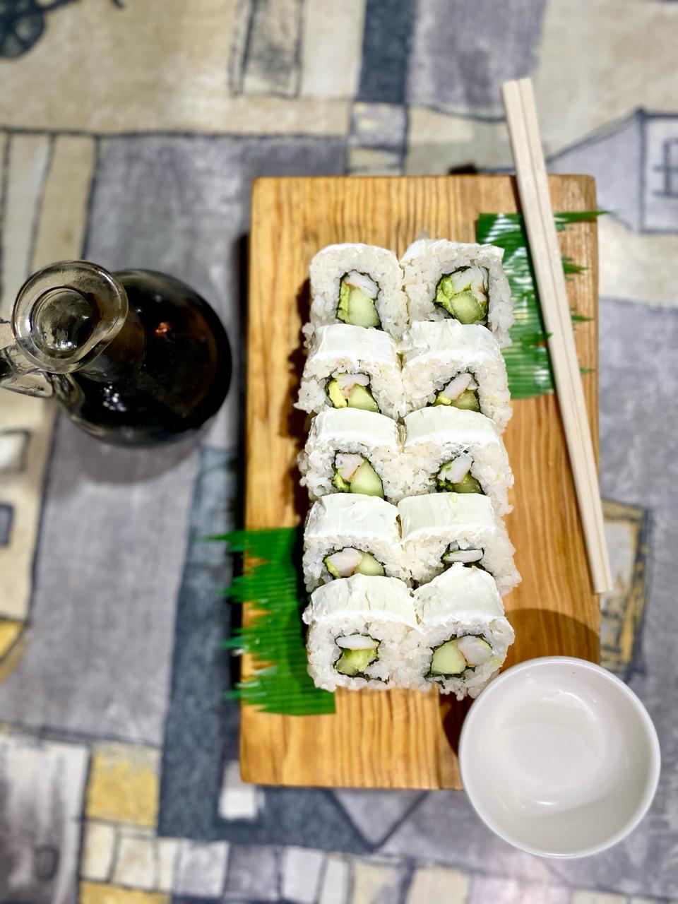 Queso, camarón, aguacate, pepino y kanikama por fuera.