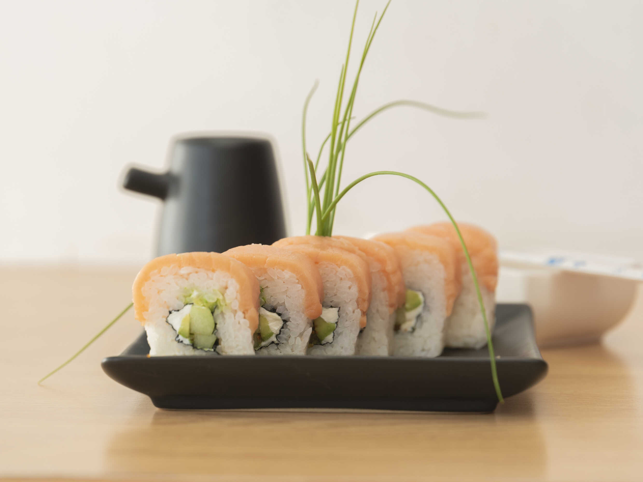 Salmón ahumado, queso philadelphia, aguacate, piel de pepino por fuera, bañado con salsa de anguila y ajonjolí.