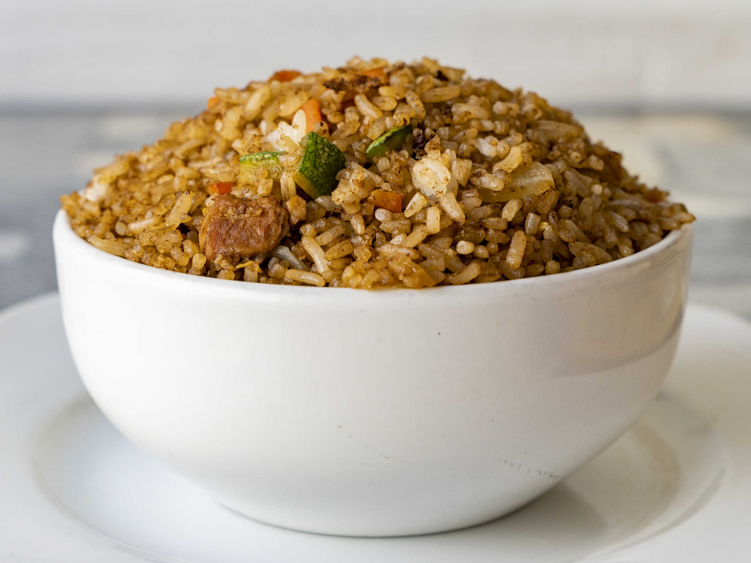 Arroz frito, zanahoria, calabaza, cebolla, pollo, arrachera, camarón y nuez de la india.