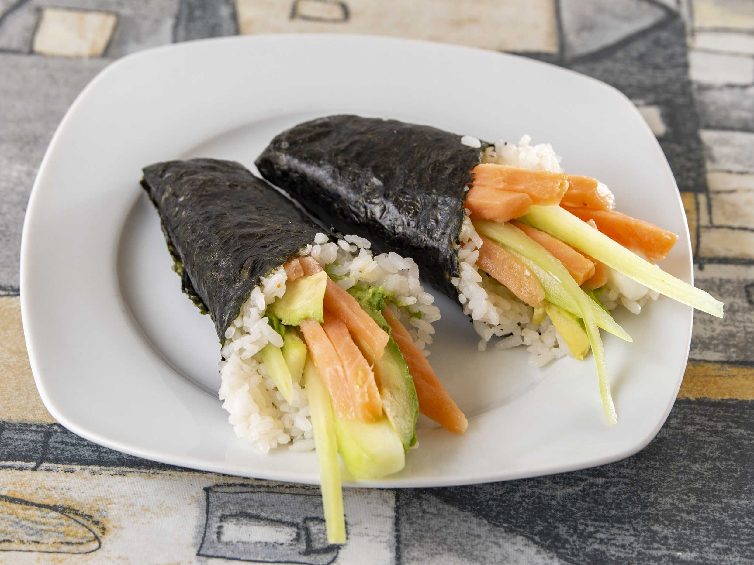 Cono de alga relleno de arroz, masago, aguacate, queso y pasta crujiente. Cono. 2 unidades.