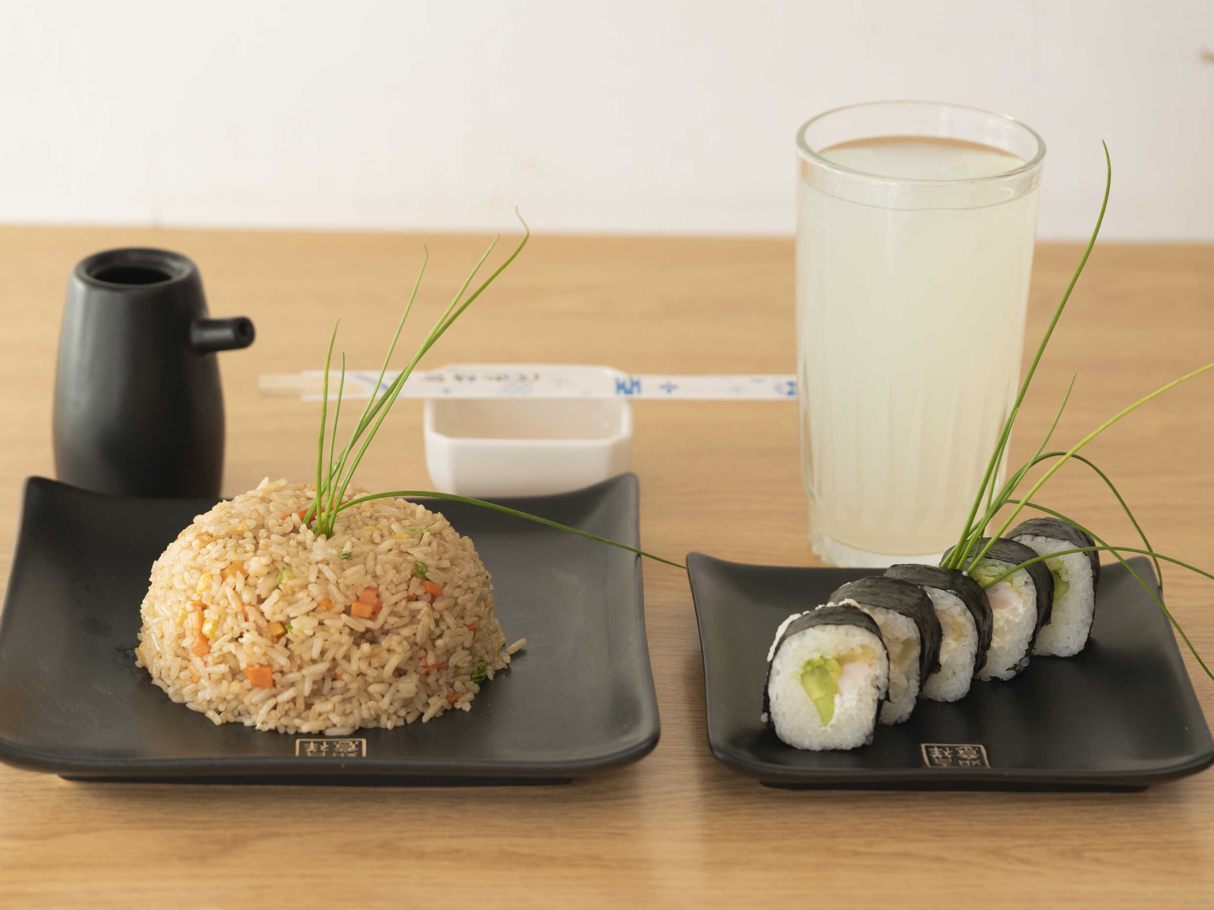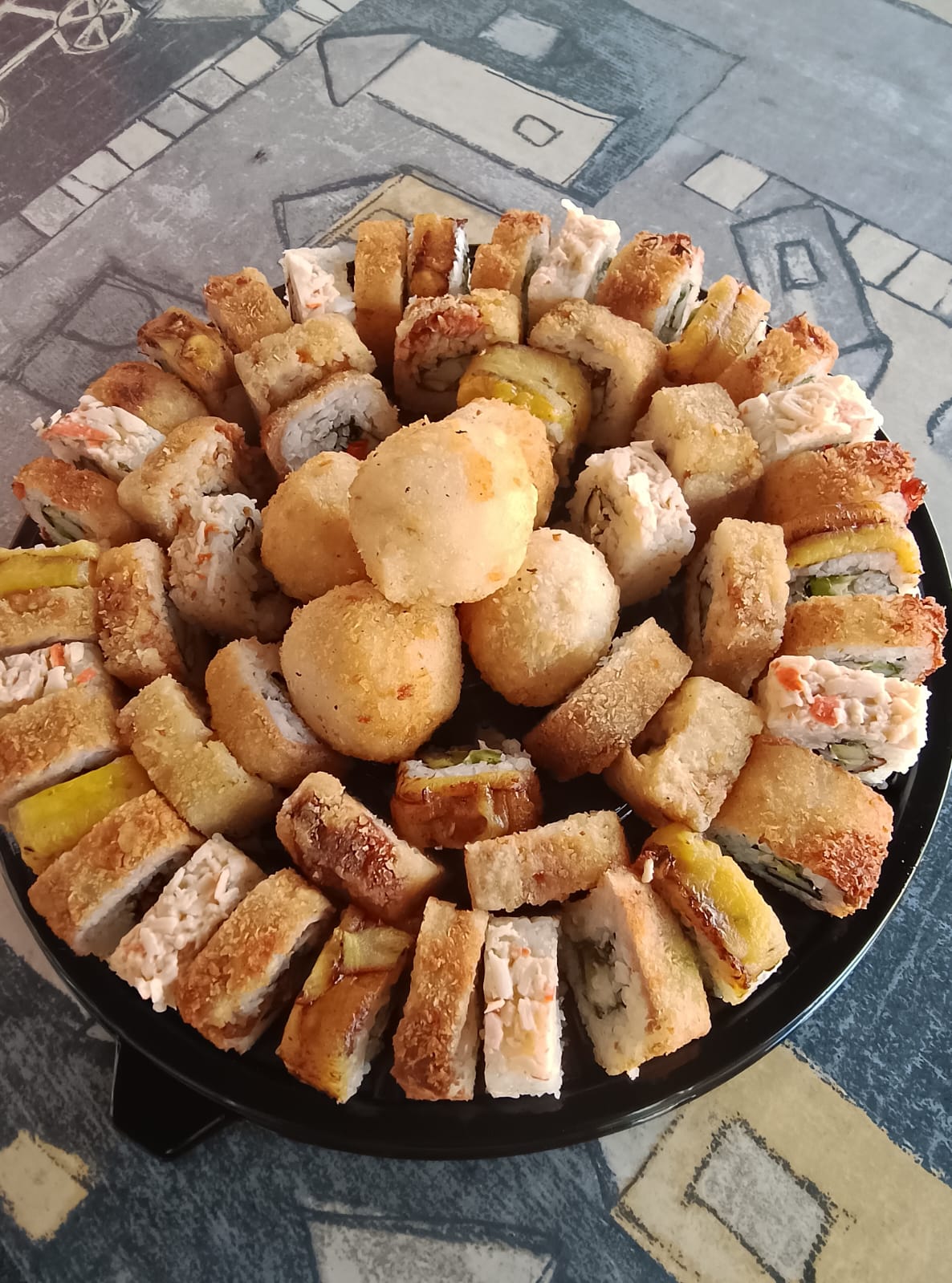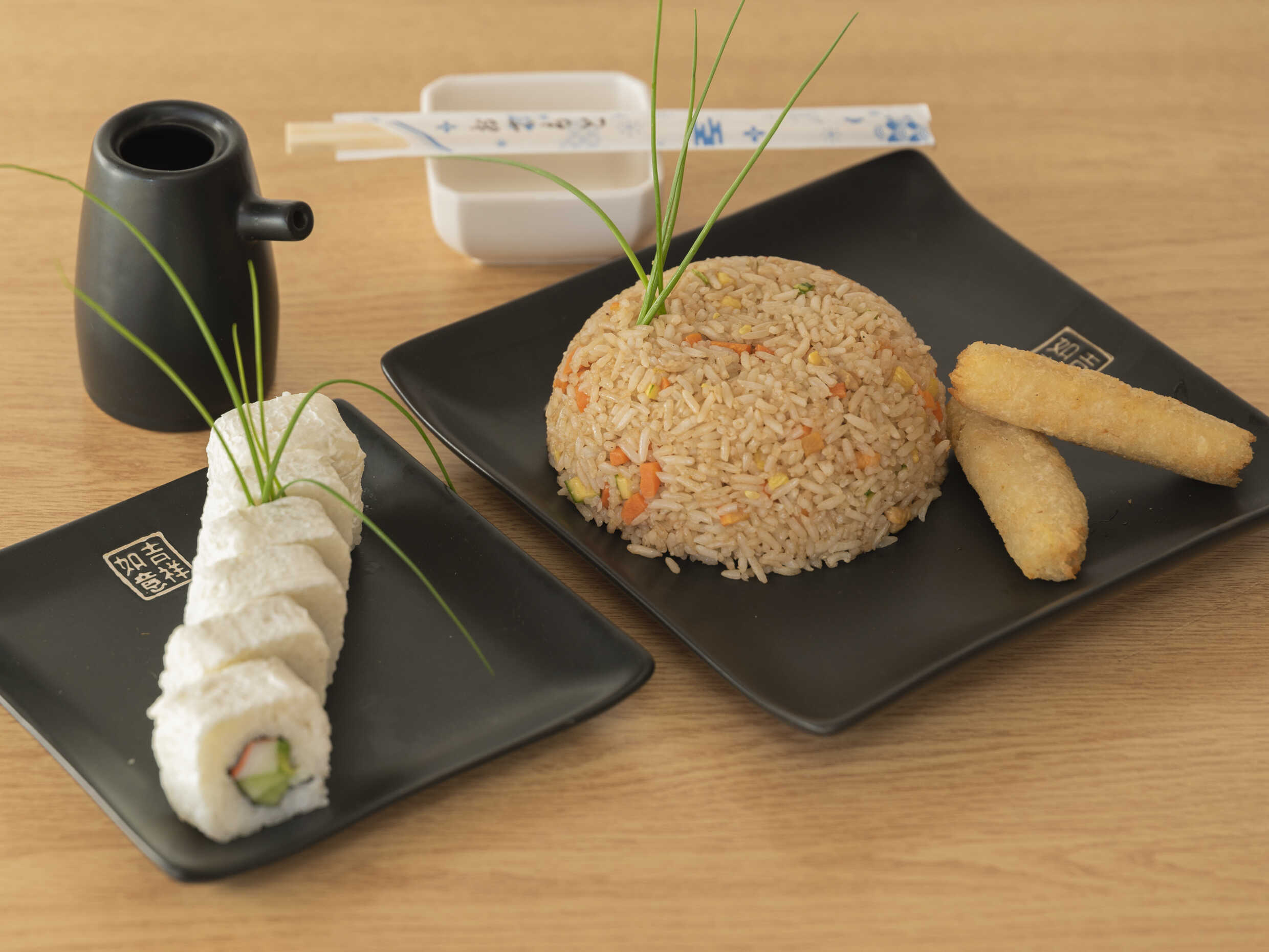 ¡Comida completa! Un yakimeshi, dos piezas kushiage de queso, un rollo de 10 piezas a elección + 1 agua de sabor de 1/2 litro.