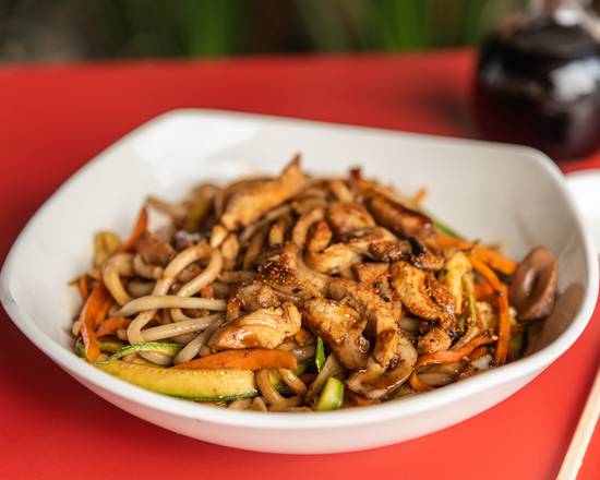 Tallarines a la plancha acompañados de verduras, camarón, pulpo y calamar, bañados en salsa teriyaki.