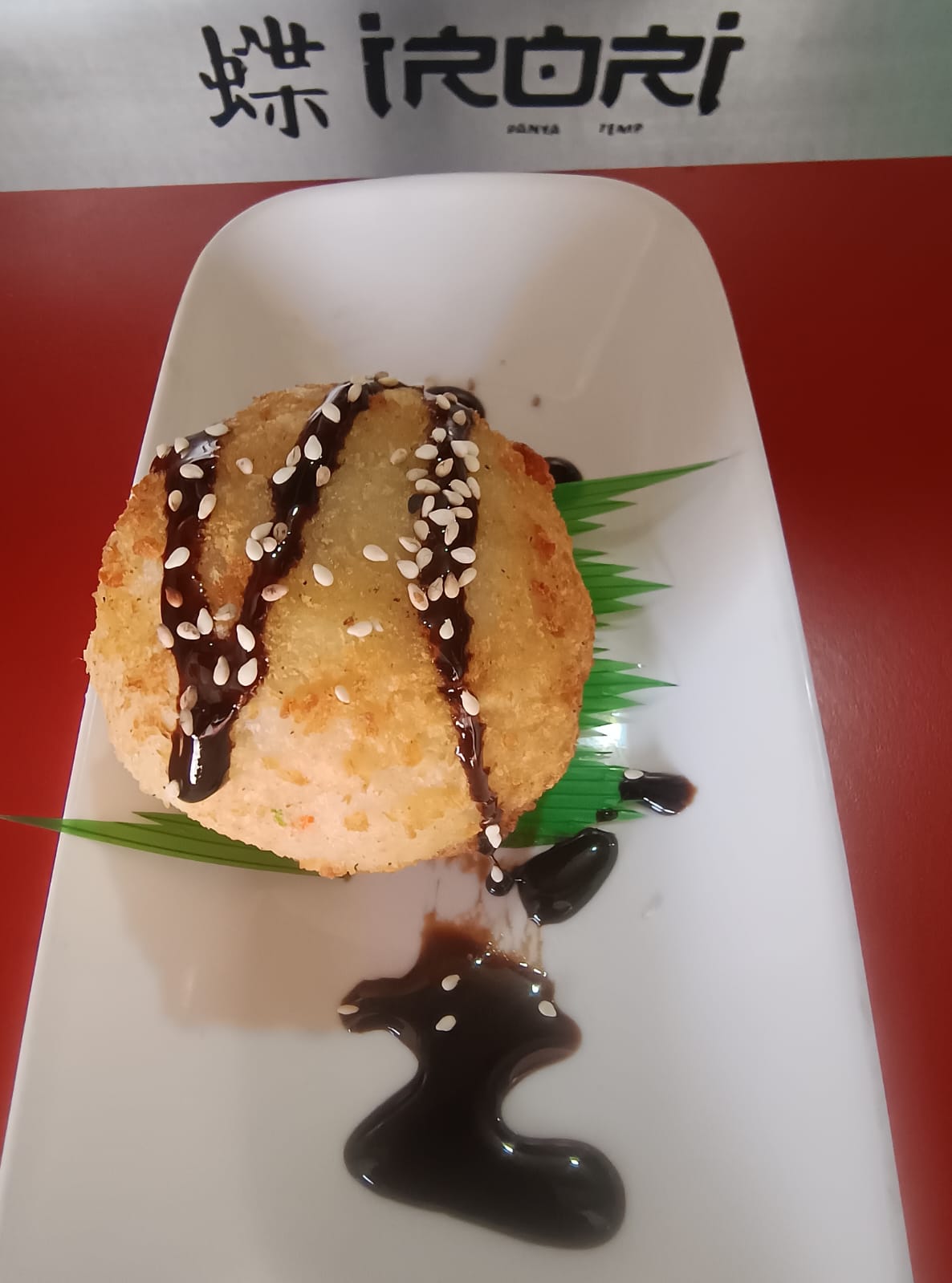 Bola de arroz rellena de philadelphia, camarón, aguacate y tampico. Empanizado con perlas de arroz y bañado en salsa de anguila.