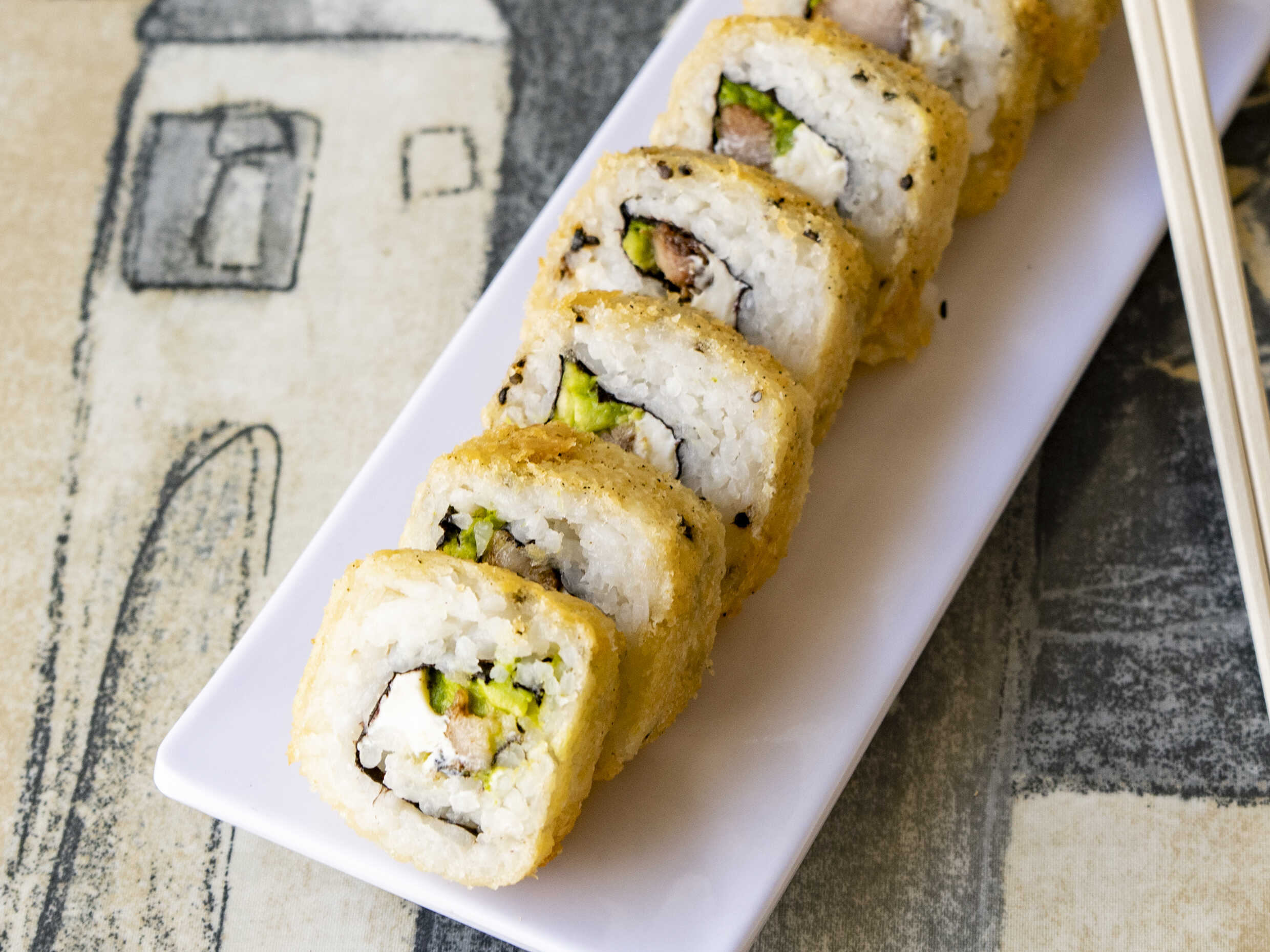 Camarón empanizado, philadelphia y aguacate. Empanizado con perlas de arroz, acompañado con salsa sriracha.